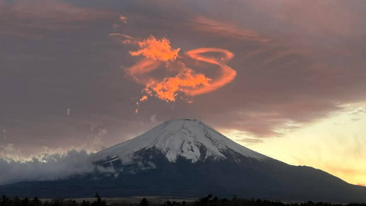 Днем 27 ноября уникальное зрелище заворожило тех, кто смотрел в сторону горы Фудзи. Когда солнце село, облака приняли форму дракона, который, казалось, пролетел над знаменитой горой.
