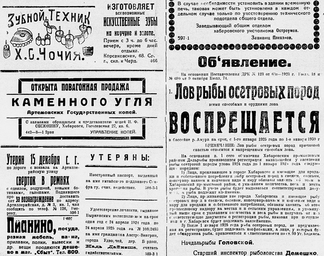 - На основании постановления Дальревкома лов рыбы осетровых пород в бассейне реке Амур запрещается с 1 января 1925 года по 1 января 1930 года всеми способами и орудиями лова. На основании сего до 1 января 1925 года производится регистрация находящейся у населения рыбы осетровой породы улова 1924 года. Лица, проживающие в Хабаровске и имеющие для продажи или личного потребления рыбу осетровой породы в свежем, соленом, консервированном, копченом виде и икру, обязаны заявить об этом в Хабаровский промысловый район с указанием веса и места хранения. Вся рыба подлежит клеймению, – гласило объявление за подписью начальника Дальрыбы Головского