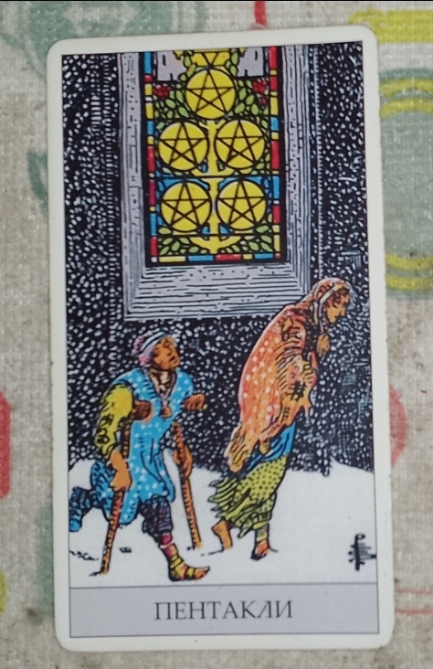 На этой карте изображено, как двое нищих бредут под витражами церкви, либо идут через пустыню. Карта даже имеет одно из названий: “переход через пустыню”. ❗Заметьте❗, что в этой карте нищие друг друга не бросают. На самом деле на практике, очень сложная для трактовки карта и в то же время довольно-таки интересная, но на самом деле, достаточно печальная. Так как она часто показывает, что у человека на данный момент сложные времена, период, который Вы, что самое важное всё же проходите и скоро данный этап Вашей жизни завершится. Очень часто эта карта показывает на самом деле 2-х партнëров: по работе, по бизнесу, либо это в семье 2 партнёра, которые переживают некие сложности на данный момент, как эмоциональные, межличностные, надо пережить это вместе и даже есть шанс спасти эти отношения, при желании. И так же это может говорить о каких-либо серьëзных, финансовых проблемах на фирме, где предположим 2 учредителя, 2 директора открыли фирму и сейчас у них есть какие-то сложности по работе. Основные позитивные моменты карты: Вы уже как-бы решаете свой вопрос, немножко потерпите, “затяните пояс потуже”, не растрачивайте свой ресурс, крепитесь, ещё Вам необходимы силы, ещё немножечко, ещё чуть-чуть и Вы выйдете на светлый путь, так же это относится и к отношениям. Карта пятëрка пентаклей на самом деле достаточно 2-х смысленная, её сложно понять, потому что, она просто показывает по факту, на каком этапе Вы сейчас находитесь.