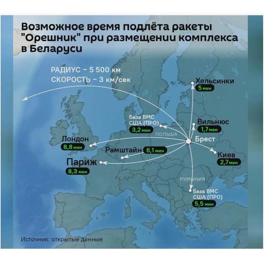На Западе же такое известие заставило снова измерять расстояние от Белоруссии до столиц некоторых стран НАТО. Картина получилась неутешительная. По сравнению с Астраханской областью, откуда запустили первый «Орешник», подлётное время ракеты сокращается приблизительно в два раза. Не зря, наверное, Владимир Путин и Александр Лукашенко обсуждают перспективы размещения ракет в Белоруссии. Кому это надо, тот поймёт.