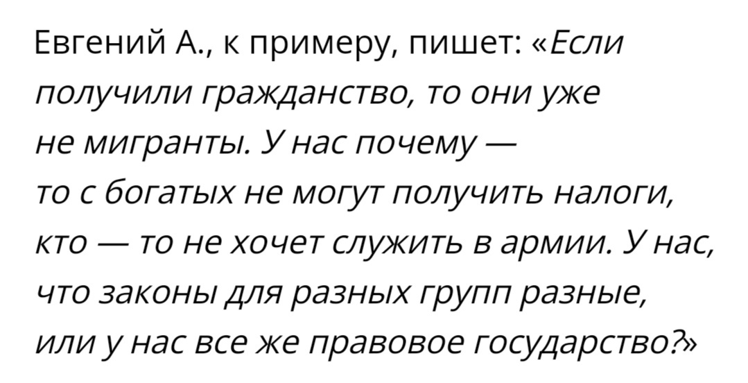 Абсолютно Ваши доводы нелогичны. Хочу начать с самого конца вашего комментария. Если и ездили работать по контракту российские граждане в Израиль или ещё какие-либо арабские страны, то во-первых ездили и работали легально, т.е. платили налоги в казну этих стран и их пребывание было определено временными рамками. А на начало вашего комментария хочу сказать следующее. Во-первых, РФ не несёт за иностранных граждан ответственность за такие моменты: где они родились, какой уровень образования они получили, какое медицинское обслуживание и другие социальные гарантии они получали в той стране гражданами которой были по рождению. И ключевые слова, если российское гражданство или вид на жительство приобретён иностранным гражданином по его собственному волеизьявлению, то он соглашается и обязуется выполнять существующие и действующие в России законы и правила. И приобретает не только права, но и обязанности. Так что, уважаемый Электрик Иван, ваши аргументы не имеют под собой ни логической, ни практической обоснованности.