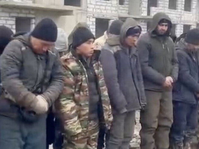 Группа мужчин в военной форме и балаклавах выстроила в ряд мигрантов, работающих на стройке, и начала агитировать их подписать контракт с Минобороны, чтобы отправиться в зону СВО.