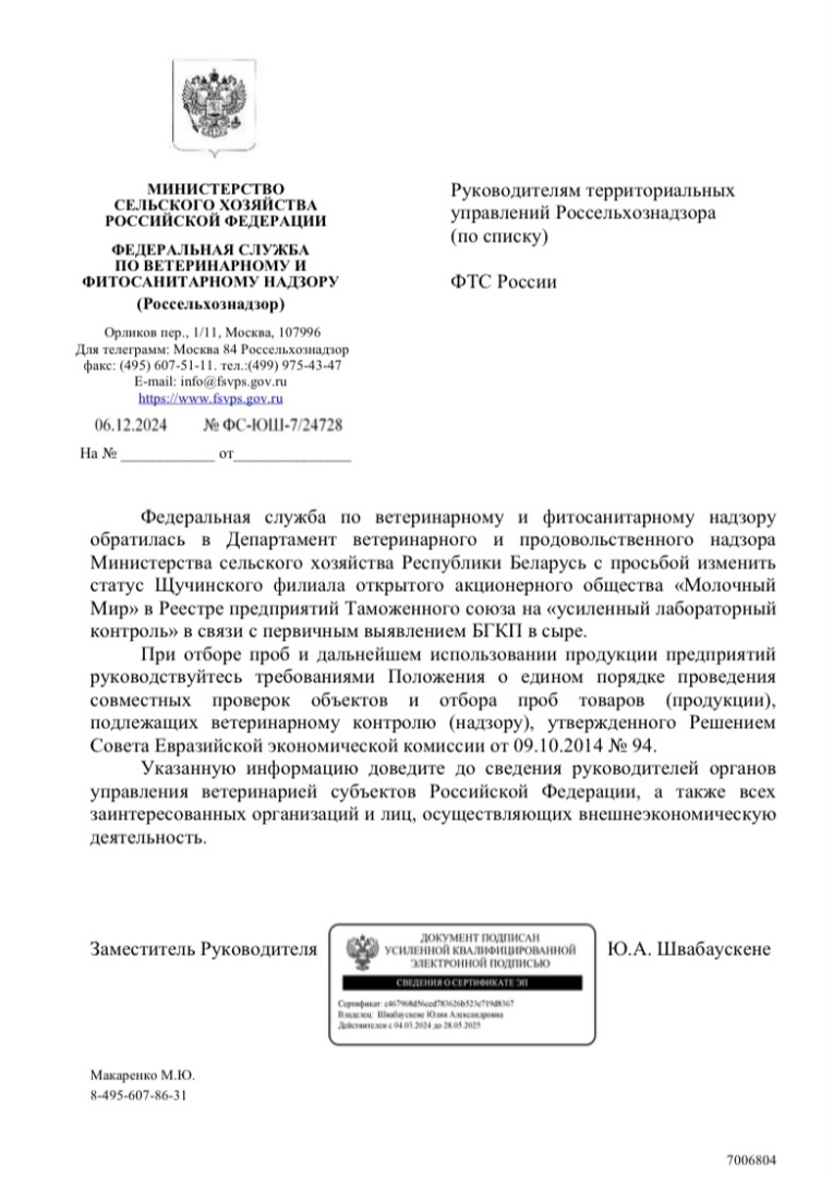 В связи с этой нехорошей ситуацией предприятие — изготовитель сыров получило статус усиленного лабораторного контроля.