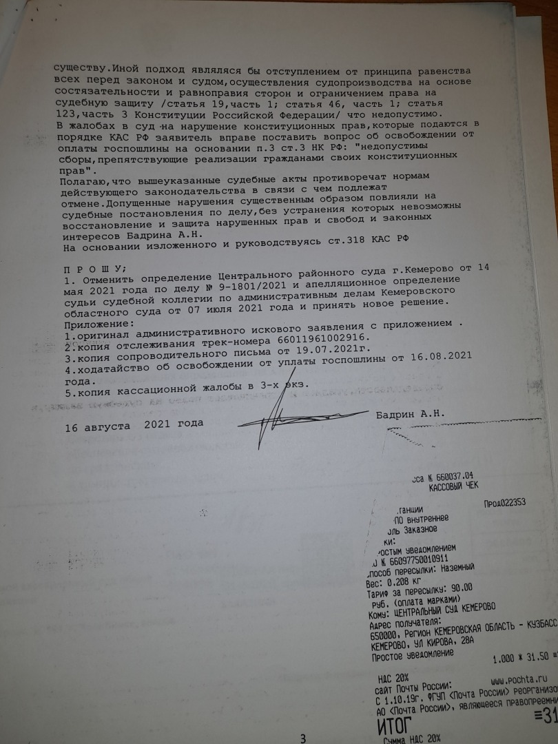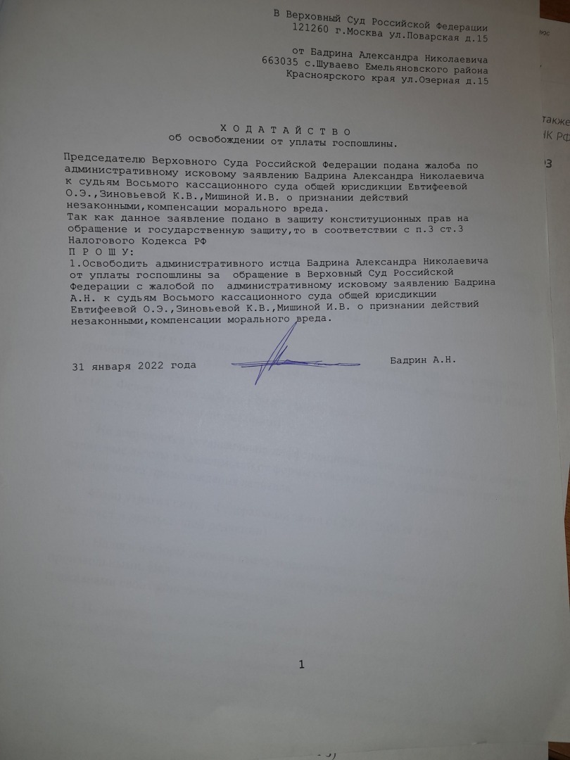 под п.4 в приложении ходатайство об освобождении от оплаты госпошлины. ВЫНЕСЕНО РЕШЕНИЕ.Подаем кассацию в ВС РФ с таким же правом по обжалованию.Вот решение