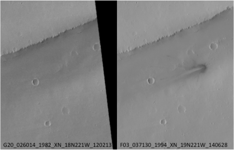 По мнению специалистов, считается, что загадочный объект упал на поверхность Марса где-то между февралем 2012 года и июнем 2014 года, что доказывается другими снимками, на которых снята местность до и после появления артефакта:
