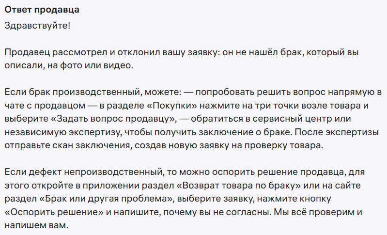 Здрасьте, приехали! Как это «не нашёл брак»? Мы же фото отправили! И видео на 40 секунд!Написала продавцу, ответа нет.