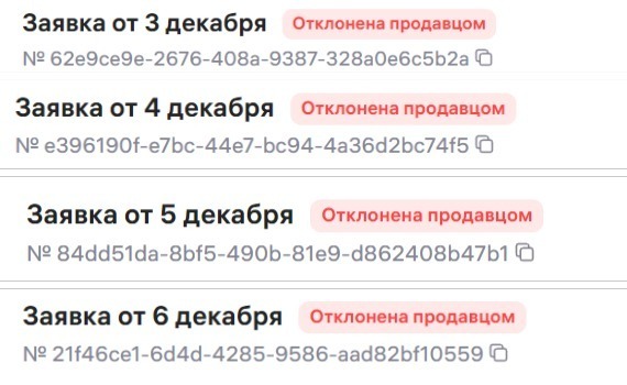 Отправила ещё несколько заявок. И везде одно и то же: заявка отклонена продавцом.