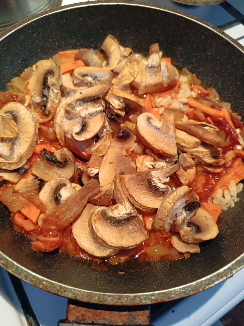 Когда смесь потушилась, 250 гр. шампиньонов. В самом конце в зажарку 15 гр. чеснока.