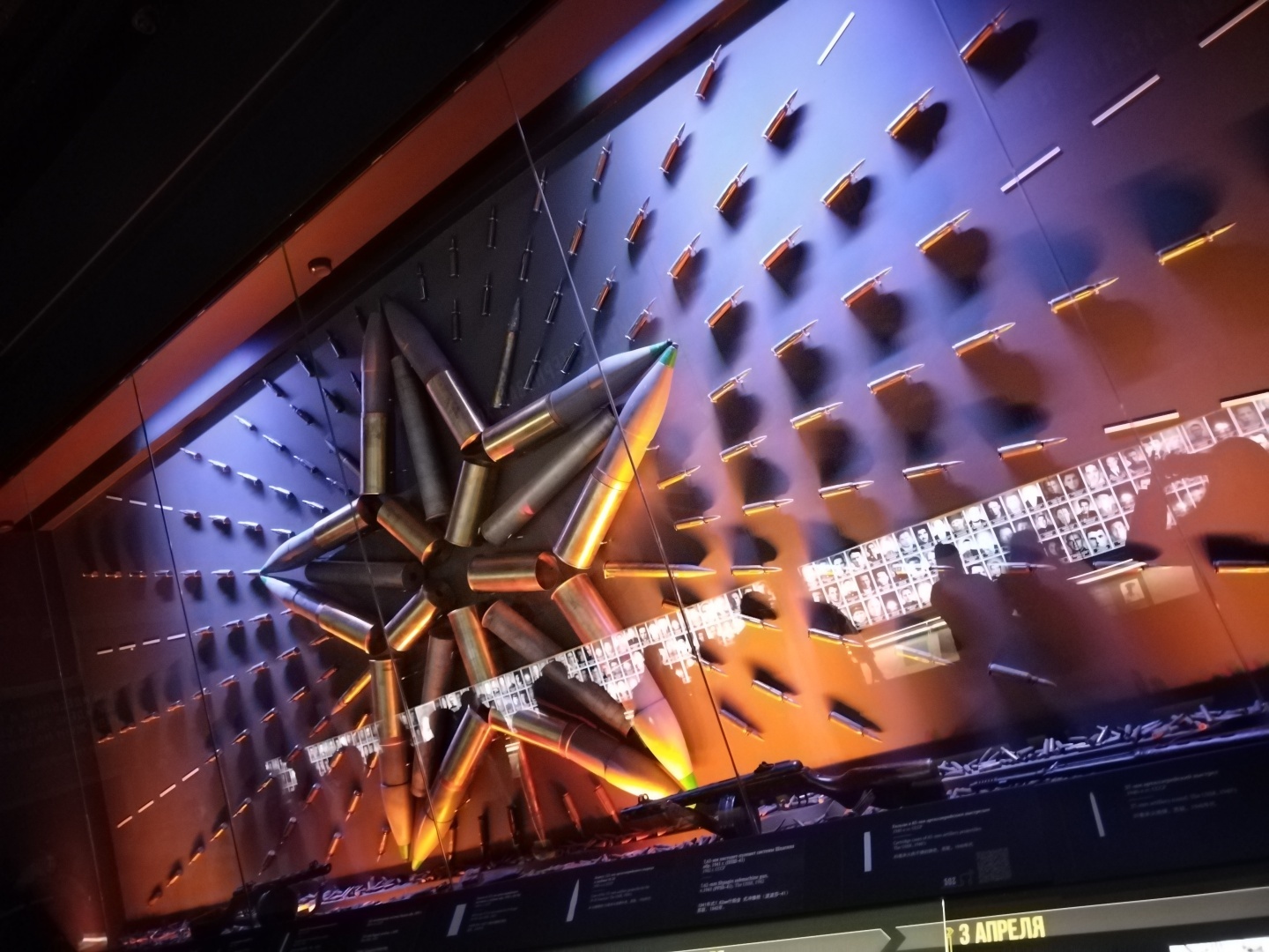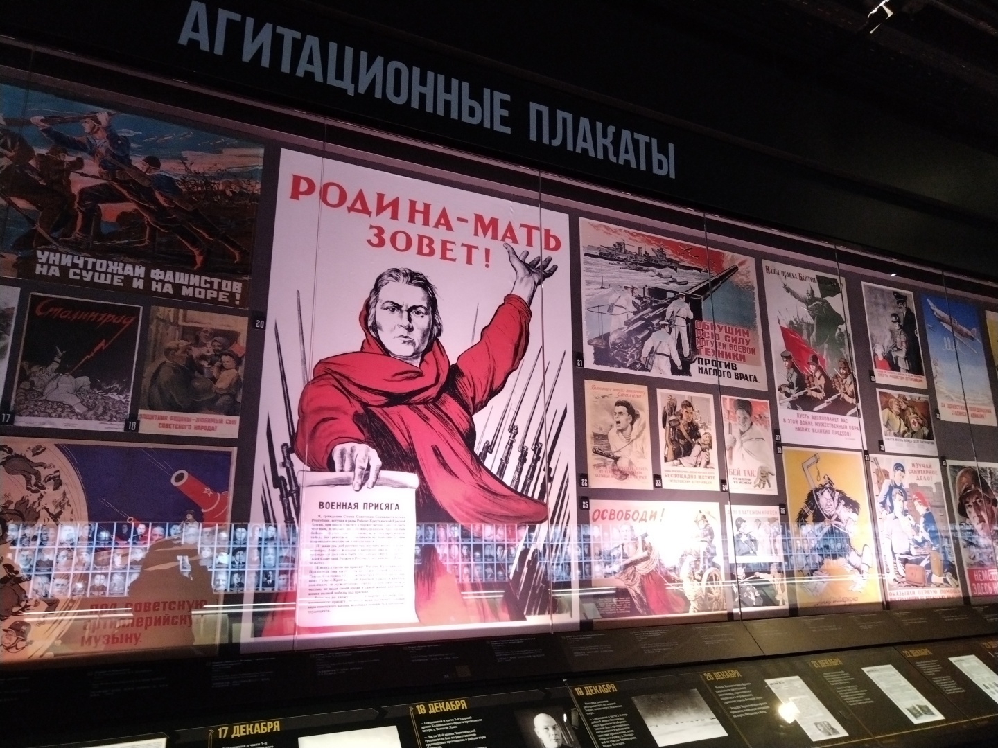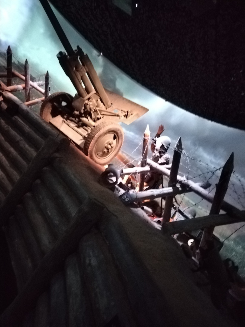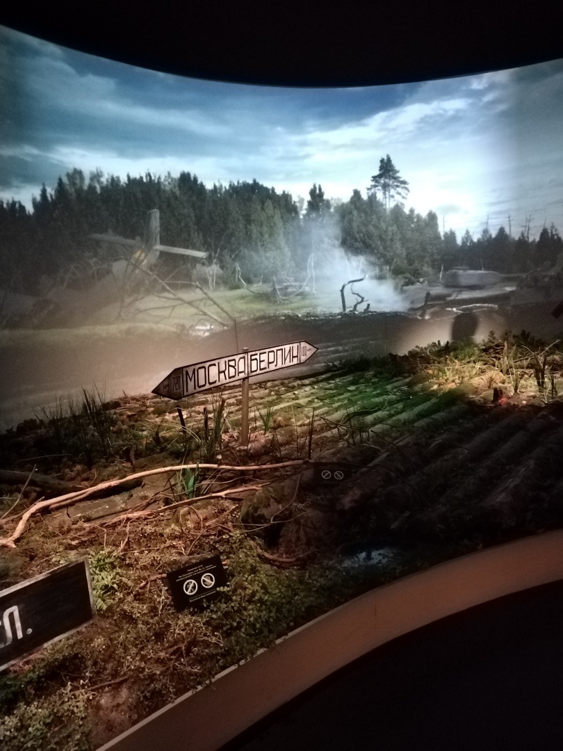 Первый зал - радостный и красочный, это день 21 июня. Дальше показаны ужасы войны. Самолёты, бомбежки, Ленинград, дорога жизни, эвакуации, труд в тылу, партизаны, концлагеря.