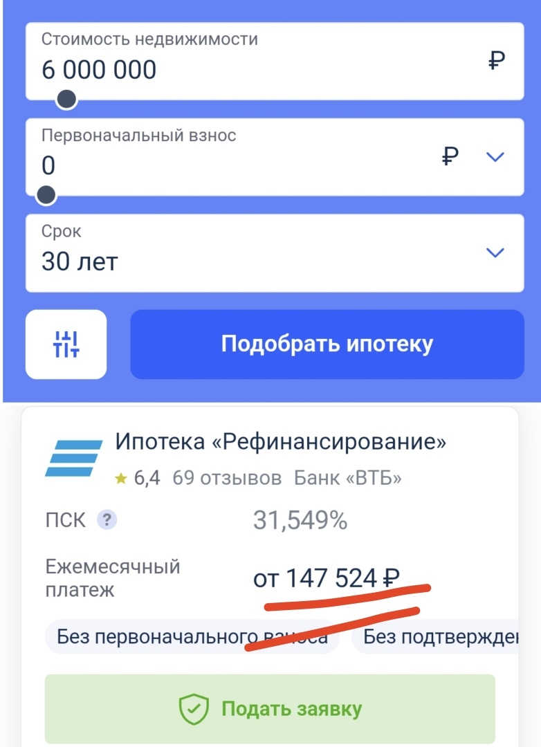 Разве может нормальный человек отдать свои "кровные," выплачивая ежемесячно 147 524 рубля х 12 месяцев в году за все 30 лет = 53 108 640 рублей?!