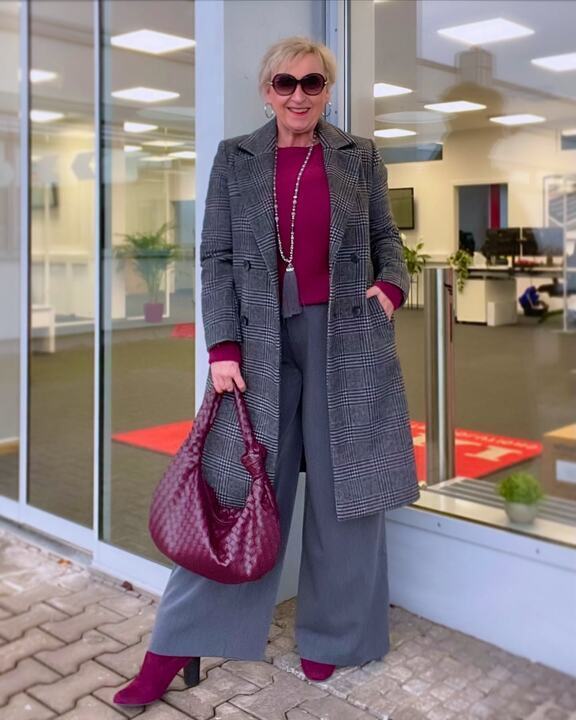 Брюки широкого кроя остаются на пике популярности. Серую модель можно комбинировать с бордовым джемпером, обувью и сумкой аналогичного цвета. Добавьте клетчатое пальто и бижутерию, чтобы создать стильный и уютный образ.