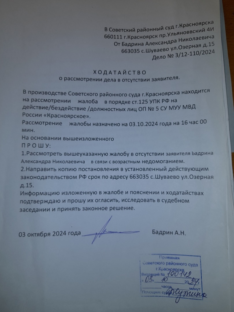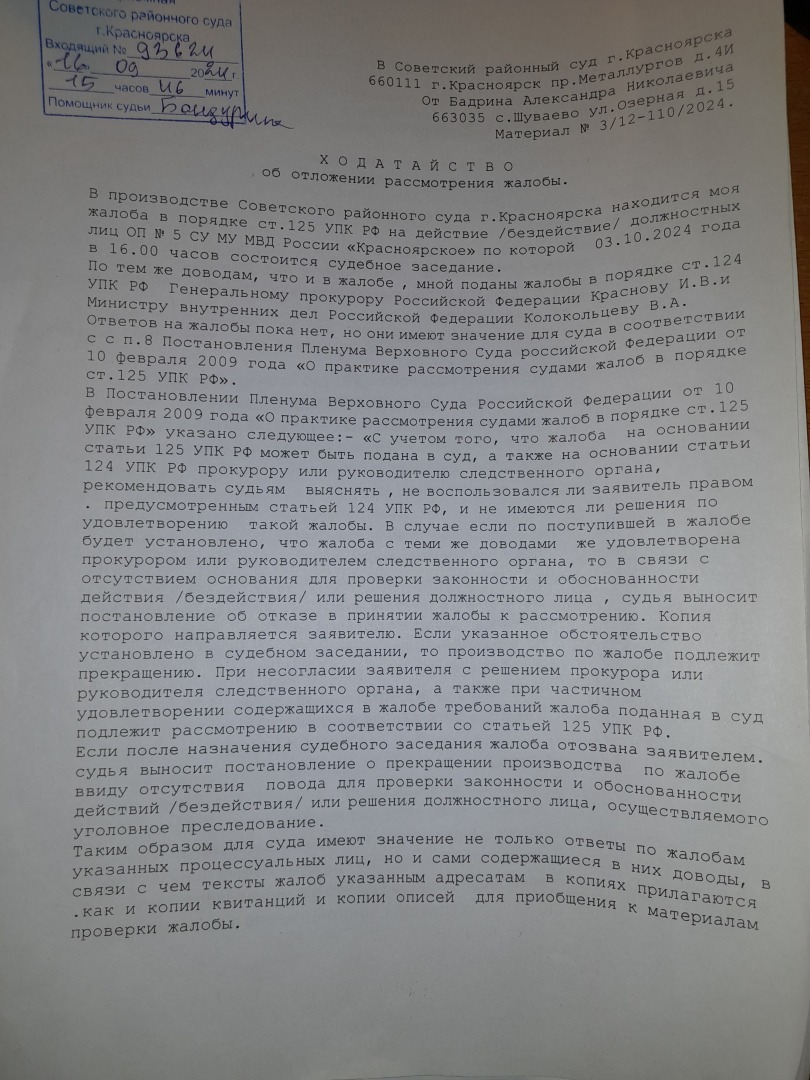 то судья должна повиноваться Пленуму Верховного Суда РФ сделать запросы и отложить рассмотрение жалобы.Но это видно в других регионах России, но не в Красноярском крае.Получаем вот такую информацию