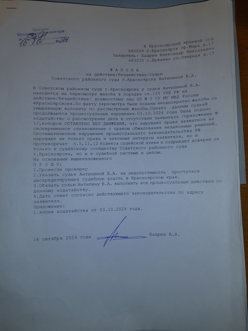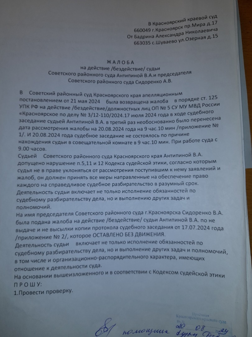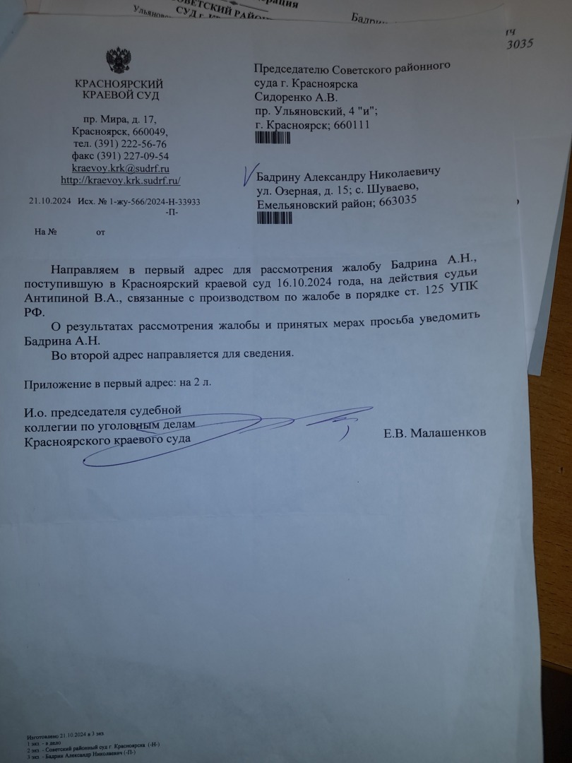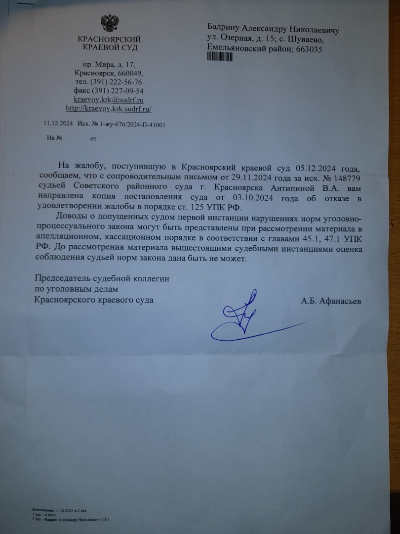 то что с принятием апелляционной жалобы к производству будут тянуть резину ЭТО ФАКТ,В данном суде это за практику,мы это уже проходили.Только жалоба в краевой суд дает старт апелляционным жалобам.А вот и подошел ответ уже председателя судебной коллегии по уголовным делам А.Б. Афанасьева. Смотрите на дату. С начало Антипина В.А. 10.12..2024 года фактически направляет копию постановления от 03.10.2024 года, а потом 11.12.2024 года дается ответ