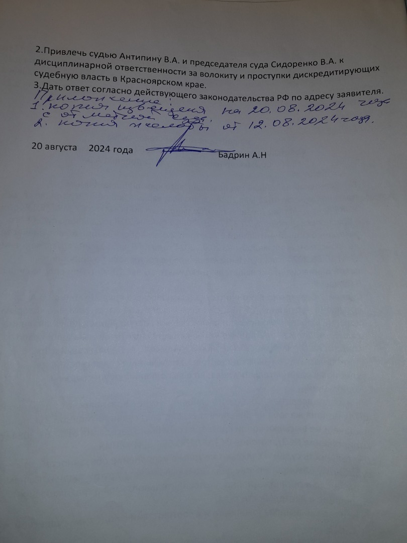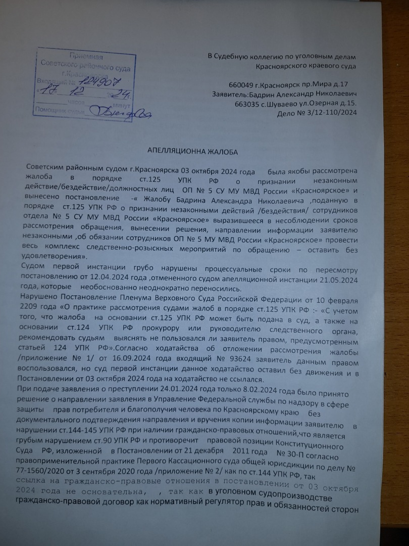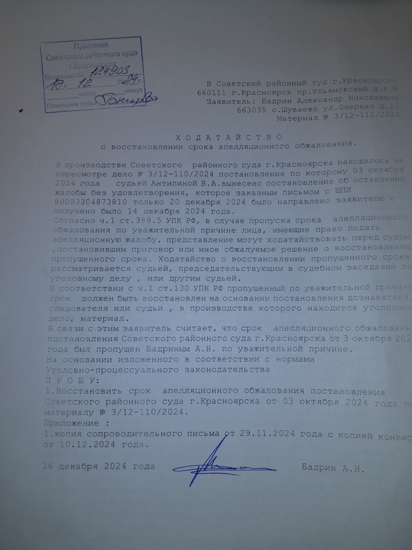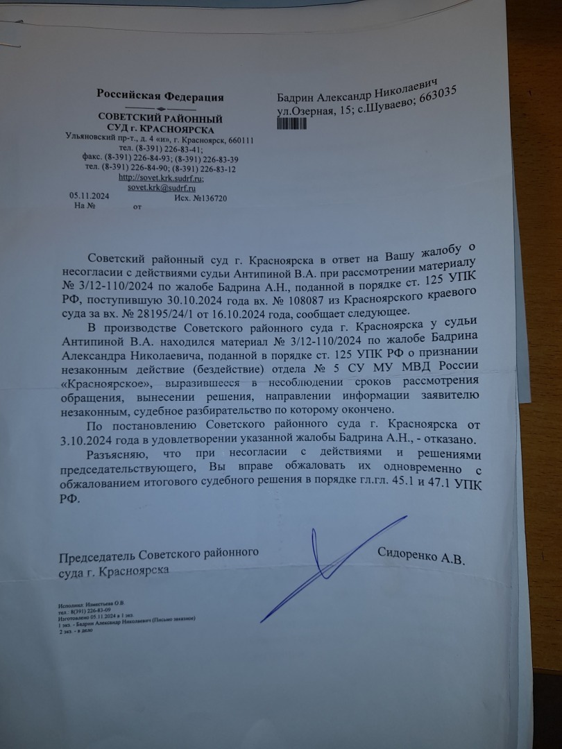то что с принятием апелляционной жалобы к производству будут тянуть резину ЭТО ФАКТ,В данном суде это за практику,мы это уже проходили.Только жалоба в краевой суд дает старт апелляционным жалобам.А вот и подошел ответ уже председателя судебной коллегии по уголовным делам А.Б. Афанасьева. Смотрите на дату. С начало Антипина В.А. 10.12..2024 года фактически направляет копию постановления от 03.10.2024 года, а потом 11.12.2024 года дается ответ