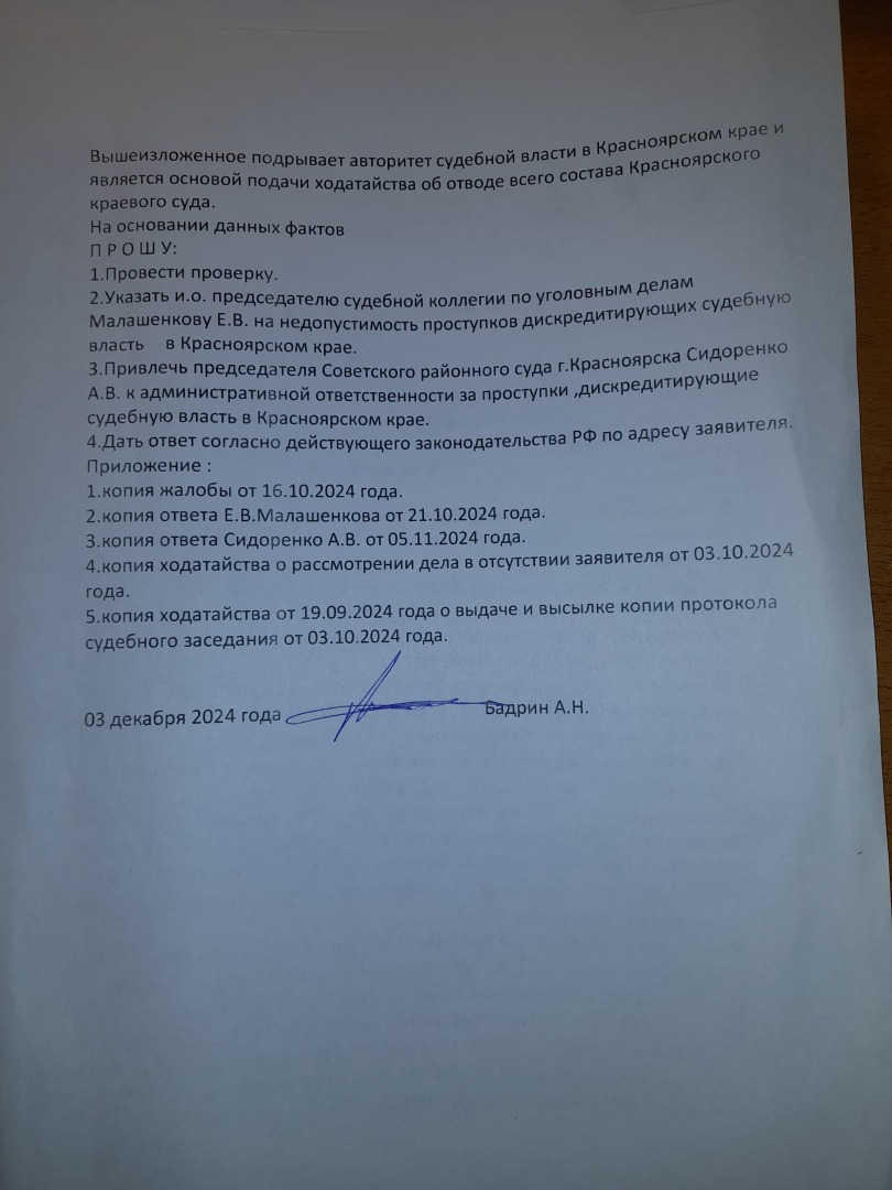 Добрый день.Опять суд и опять бардак.Полагаю есть кодекс судейской этики.Пора уже разрабатывать и принимать кодекс судейского беспредела.Создавать инициативную группу и полагаю в этом кодексе будут одни факты беспредела.Одна из тем судейского состава Красноярского края. Когда судья умышленно тянет время между судебными заседаниями рассмотрения жалобы по 125 УПК РФ при том , что правом ускорения уже воспользовался - ОТКАЗАЛИ.Жаловаться председателю суда лишняя трата времени .Ниже узнаете почему.Звонок в краевой суд данной жалобой сделан