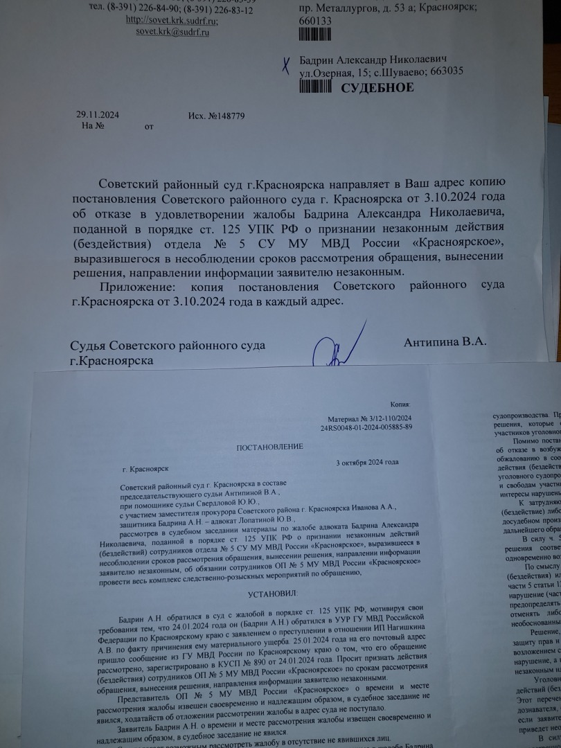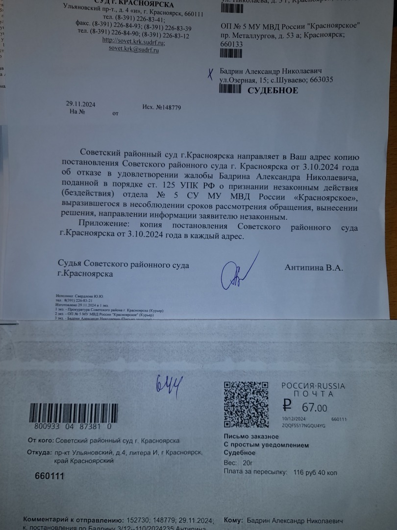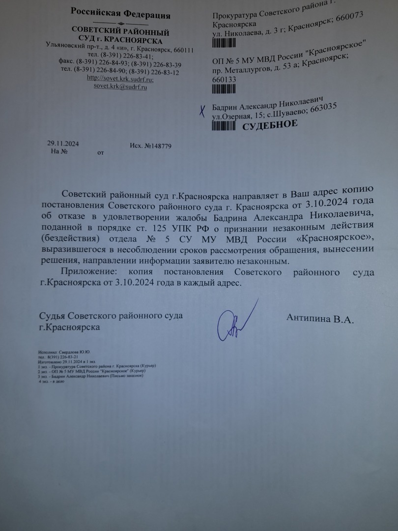 теперь поняли почему не стоило беспокоить председателя Советского районного суда Сидоренко В.А. - все делалось судьей по его указке.А теперь смотрим на даты.Жалоба поступила 05.12.2024 года .Вроде как до данной даты судья Антипина В.А. ВСПОМНИЛА что нужно направить копию постановления