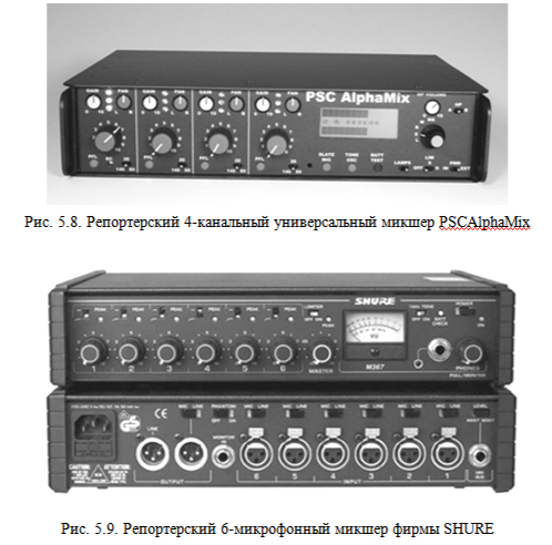 Несколько в стороне стоят так называемые «репортерские» микшеры, предназначенные для выездных сессий звукозаписи, и которые, несмотря на скромные размеры, выполняются на самом высоком техническом уровне и по этой причине могут стоить недешево. С помощью таких микшеров в полевых условиях осуществляется запись репортажей с массовых мероприятий, этнической музыки, звуков живой природы, они используются для записи звукового сопровождения видео- теле- и кинофильмов, а также для проведения выездных конференций и семинаров (рис. 5.8 и 5.9).