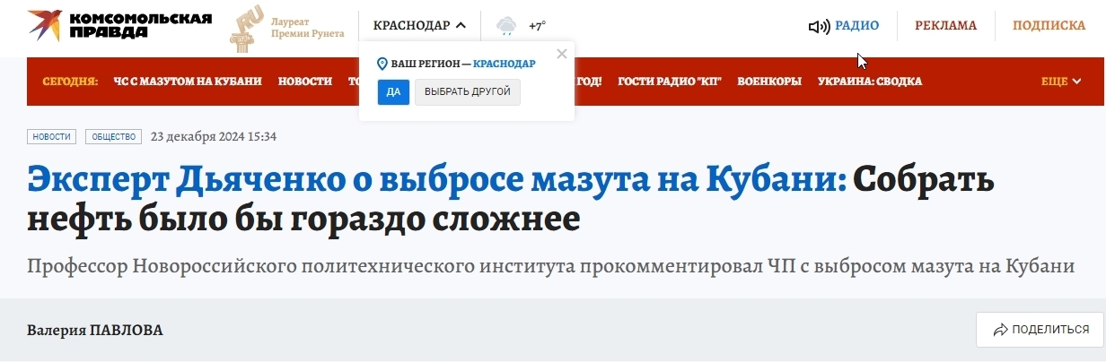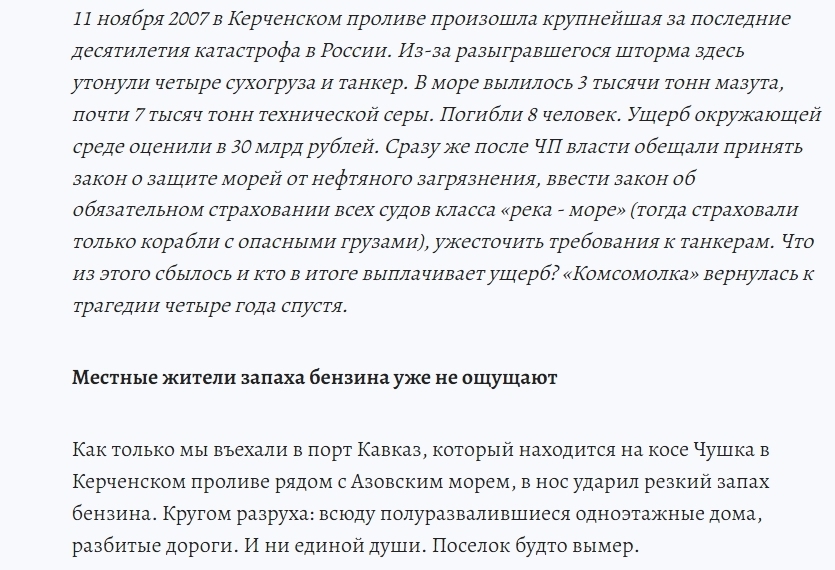 И вот какое удивительное совпадение. Керченский пролив. Шторм, танкер и три тысячи тонн мазута.