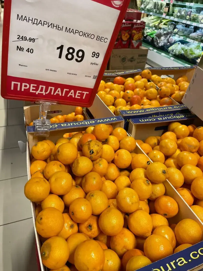 Теперь фрукты! Бананы – 150 руб. Они всегда были по цене картошки. Мандарины Марокко 190р (отвратительные), жёсткая шкурка и кислые. На улице продают маленькие с листиками, вкусные сладкие, но по 300 руб.! Ягоды всегда были дорогими в не сезон, поэтому не удивляюсь. Тухлый виноград – 650 руб.! Выкинуть ведь жалко! Ананасы на праздничный стол по 400 руб., можно взять, кто любит. Не каждый день их едим. Сезонная хурма – 200 руб., тоже можно побаловать себя, через пару недель и такой не будет.