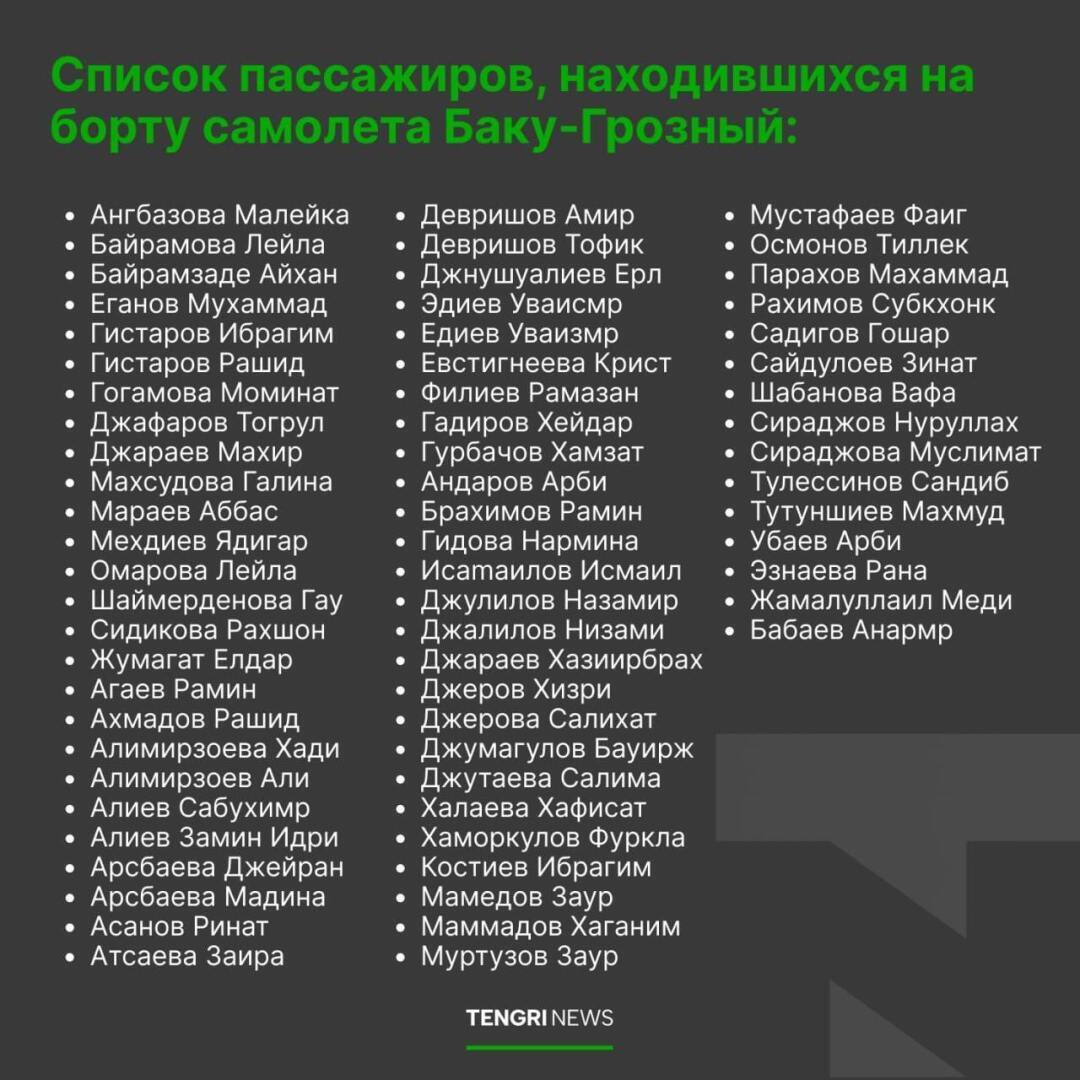 Публикация Tengrinews представила список пассажиров самолета, потерпевшего крушение в Актау, на основании информации, предоставленной авиакомпанией Azerbaijan Airlines.