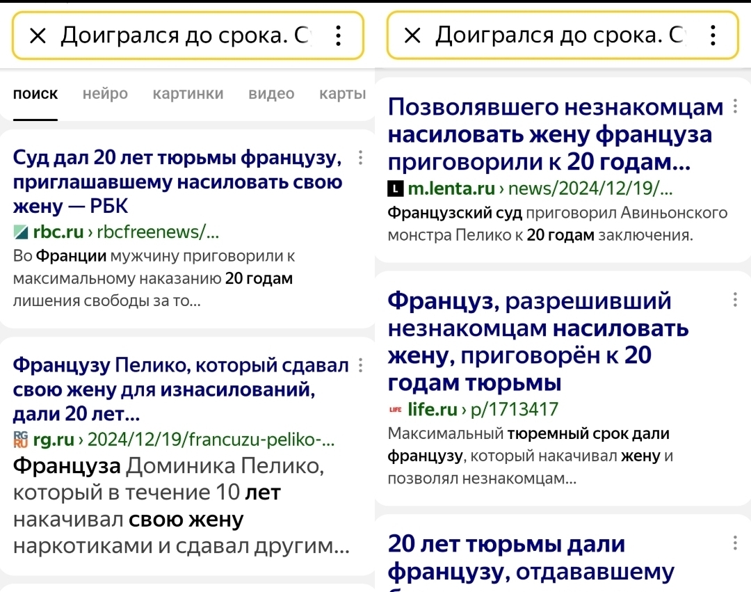 Например, на днях была задана такая тема: "Доигрался до срока. Суд дал 20 лет тюрьмы французу, приглашавшему насиловать свою жену".