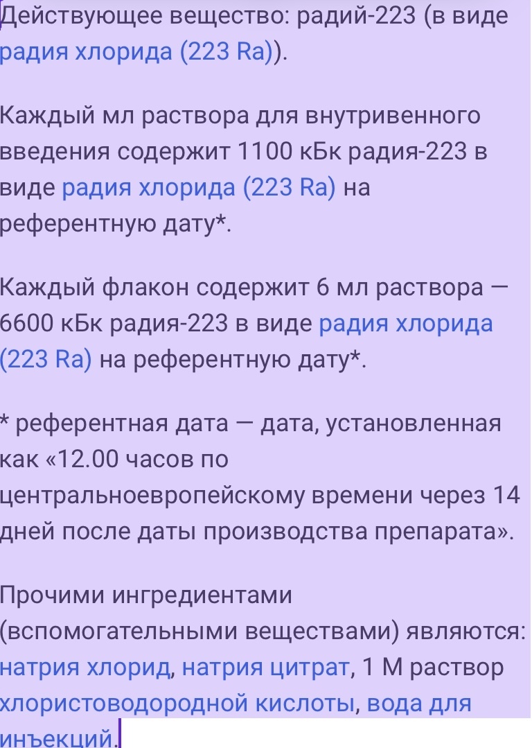 Стоит учитывать то, что препарат нельзя принимать тем людям, у кого имеется аллергия на радия хлорид 223Ra. Также, необходимо ознакомиться с листком вкладышем к препарату, где раздел 6 перечисляет содержащиеся в нем компоненты, на которые возможна аллергия.