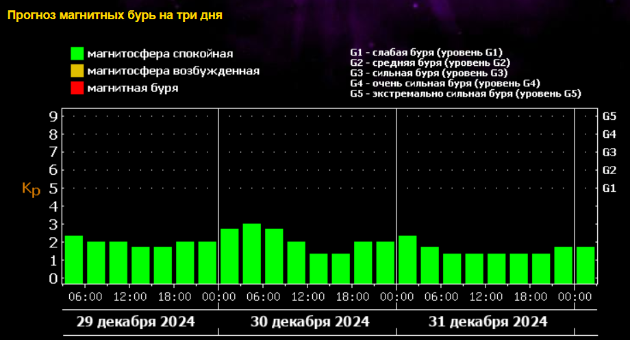 29 декабря ожидается Кр-индекс 1-2 балла, что соответствует спокойной геомагнитной обстановке.