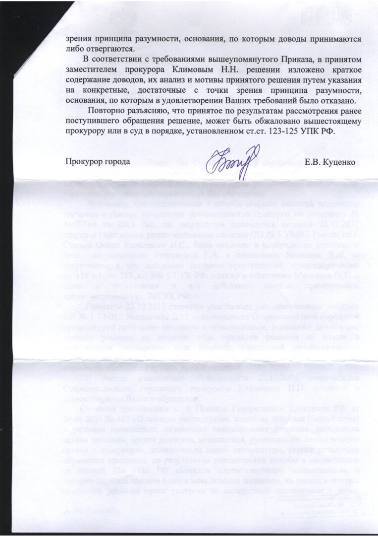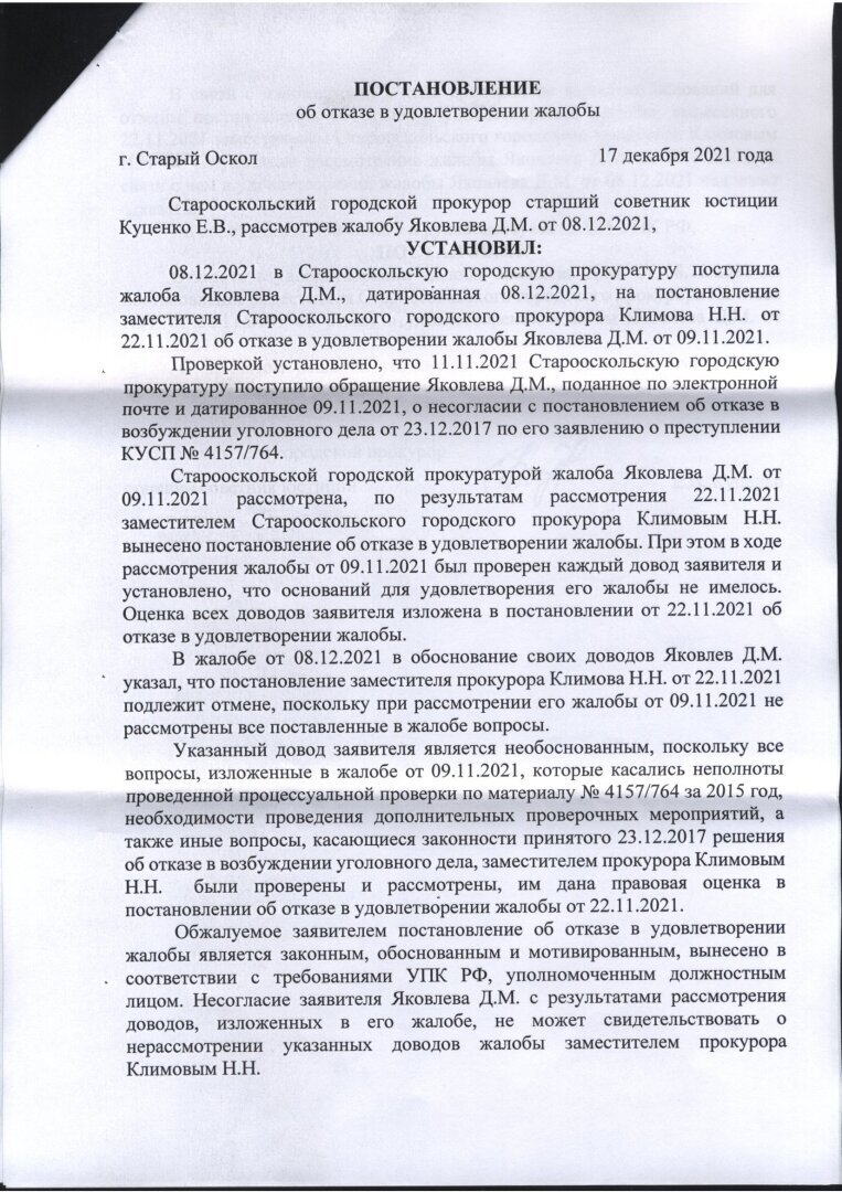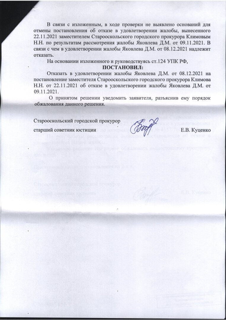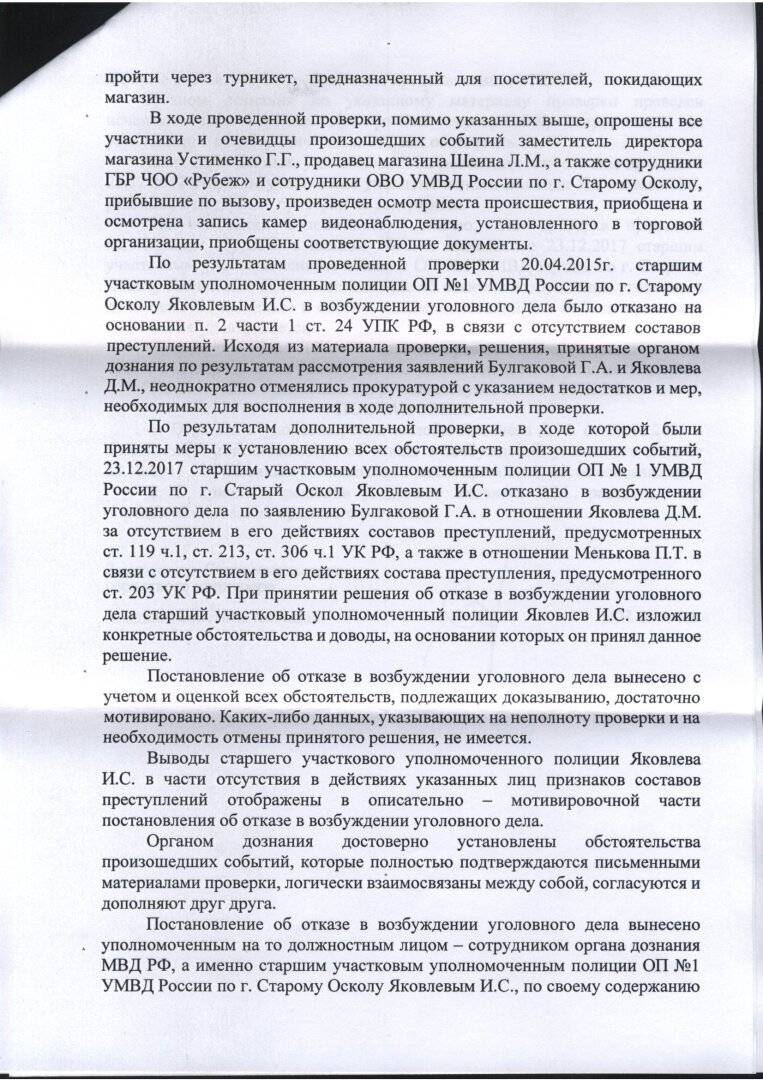 В 2017 году было вынесено очередное постановление, которое я обжаловал в Старооскольском городском суде. Суд намеренно и необоснованно отказал в удовлетворении жалобы покрывая преступную деятельность полиции. Обжаловать выше также не удалось.