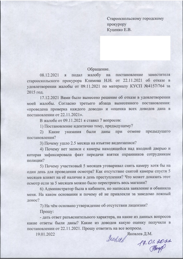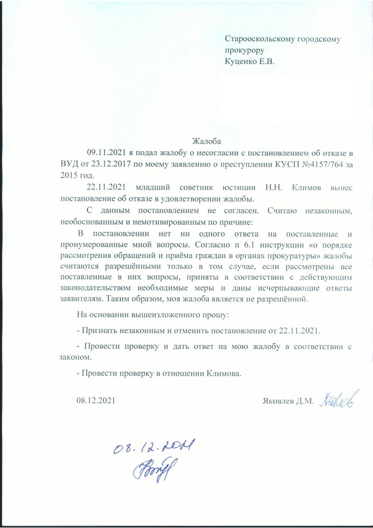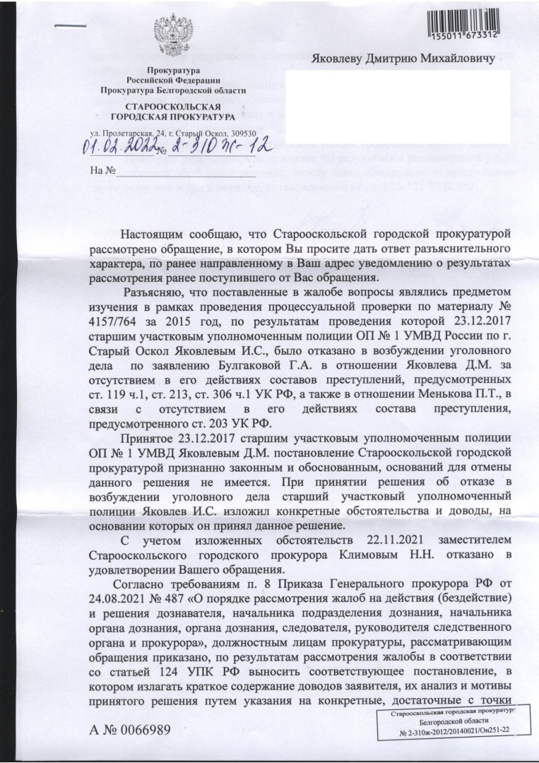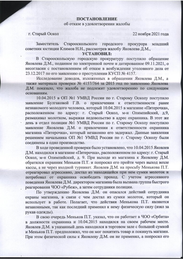 В 2017 году было вынесено очередное постановление, которое я обжаловал в Старооскольском городском суде. Суд намеренно и необоснованно отказал в удовлетворении жалобы покрывая преступную деятельность полиции. Обжаловать выше также не удалось.