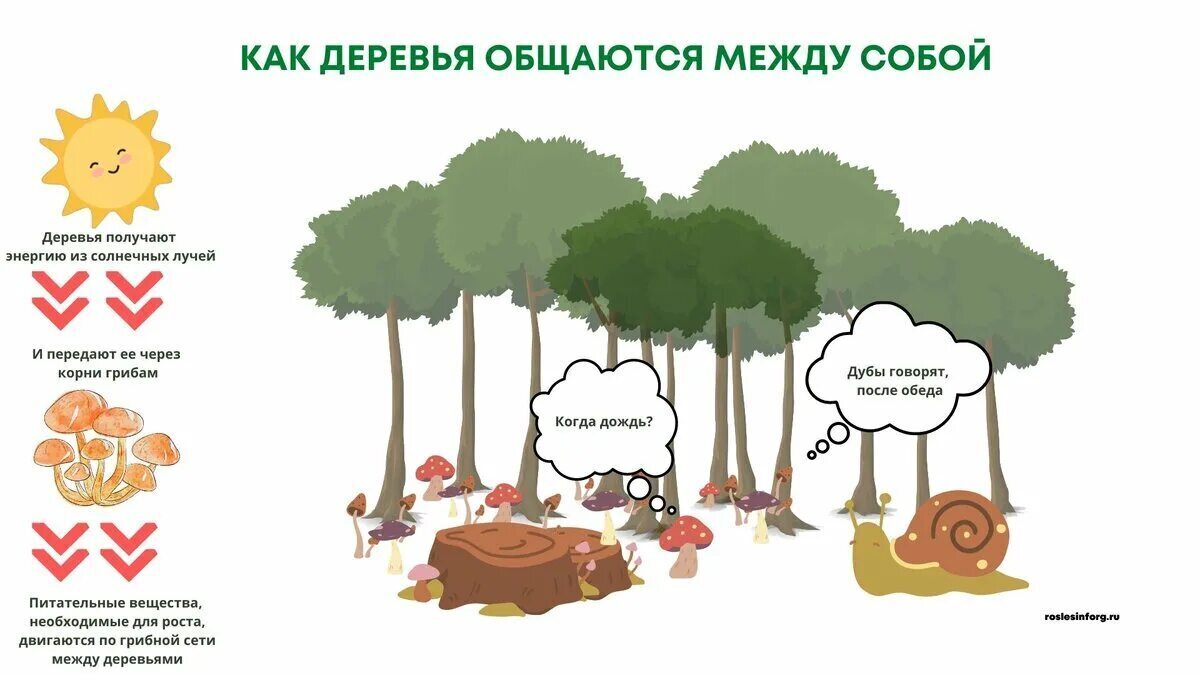 2. Деревья общаются друг с другом: Через корни и грибковую сеть, деревья могут обмениваться информацией о паразитах, воде и других важных ресурсах, создавая своего рода "интернет леса".