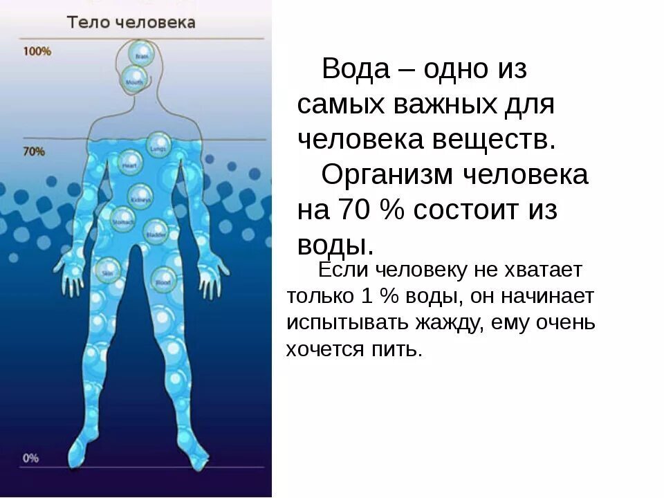 4. Состав тела: Человеческое тело состоит на 70% из воды, что подчеркивает важность правильного гидратации для здоровья и хорошего самочувствия.