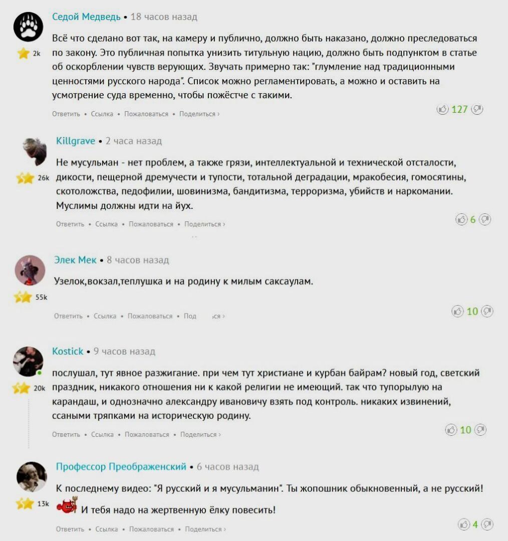 По большому счёту, внутри своих диаспор и прочих ОПГ, эти люди могут делать всё, что угодно, хоть скакать голыми вокруг языческих истуканов, но им надо обязательно выползти на публику и на всю страну оскорбить россиян, пытаясь закидать словесной грязью самые любимые народом вещи. Юристы лучше знают, ну а по мне, идёт самое наглое и безнаказанное разжигание религиозной и национальной розни, за которое есть соответствующее наказание в статьях УК. Или как?