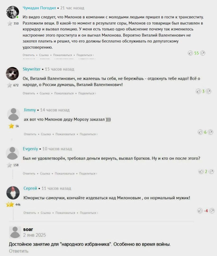 Я ответил на вопрос о пользе Миронова что да, полезен. Просто хочу обосновать свой ответ на примере скажем одних из маргинальных элементов как матёрые алкоголики, которые довольно часто становятся потом бомжами ввиду образа жизни. Ведь они и тоже полезны для общества как пример того как не надо делать. Это я к тому что абсолютно бесполезных людей не бывает, просто из каждой ситуации или конкретного примера жизни определённого человека можно вынести урок, некий опыт, который не купишь за деньги. Другое дело что не все хотят делать выводы и анализировать. И кстати на счёт депутатов и мигрантов. Тут один тоже высказался один депутат по поводу них у меня на странице выложено видео с его высказыванием. Советую посмотреть.