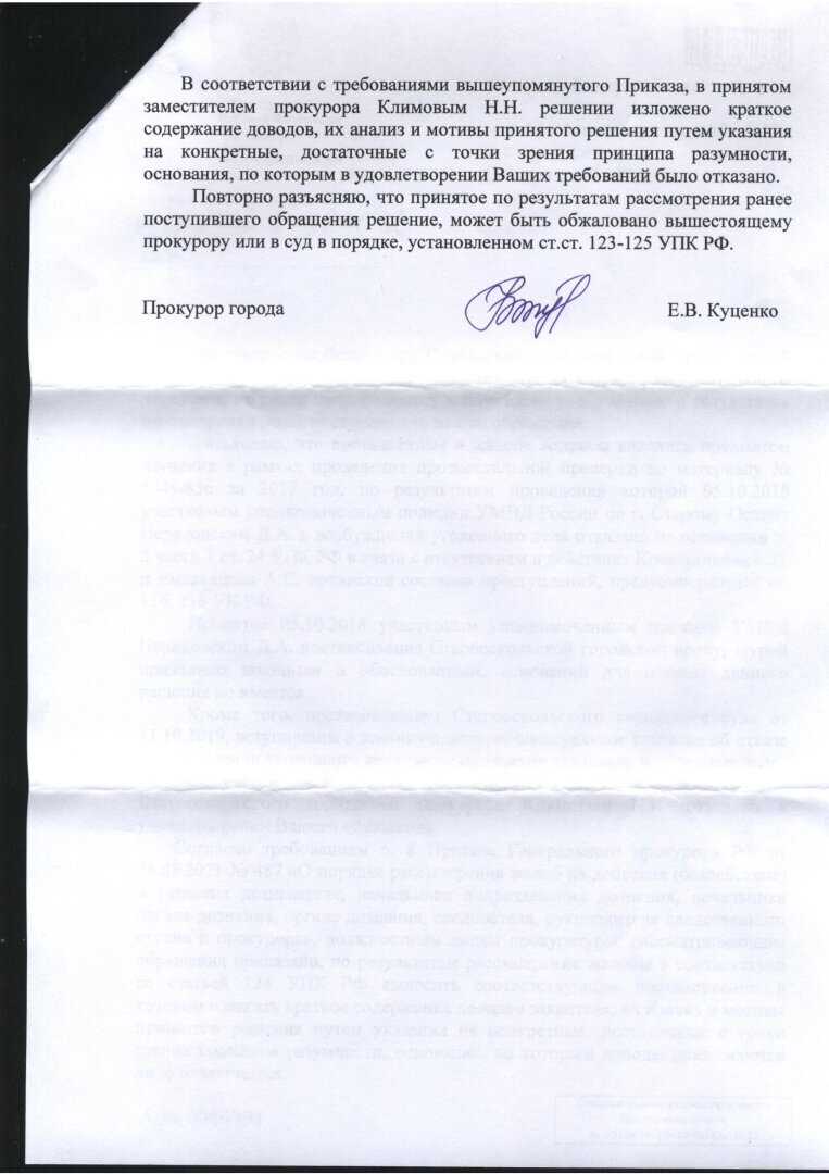Данный вопросы остались без ответов. В соответствии с п. 6.1 инструкции «о порядке рассмотрения обращений и приёма граждан в органах прокуратуры» моя жалоба осталась неразрешённой.