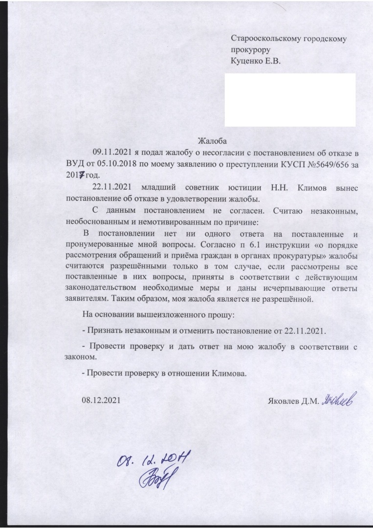 В 2017 году в отношении меня было совершено уголовное преступление. Я обратился с заявлением в полицию. Заявление у меня приняли, присвоили номер КУСП 5649/856, но вместо проверки сотрудники полиции совершили в отношении меня уголовные преступления, намеренно занимались сокрытием доказательств, игнорировали указания прокуратуры и покрывали преступников. Регулярно выносили заведомо незаконные постановления об отказе в возбуждении уголовного дела.