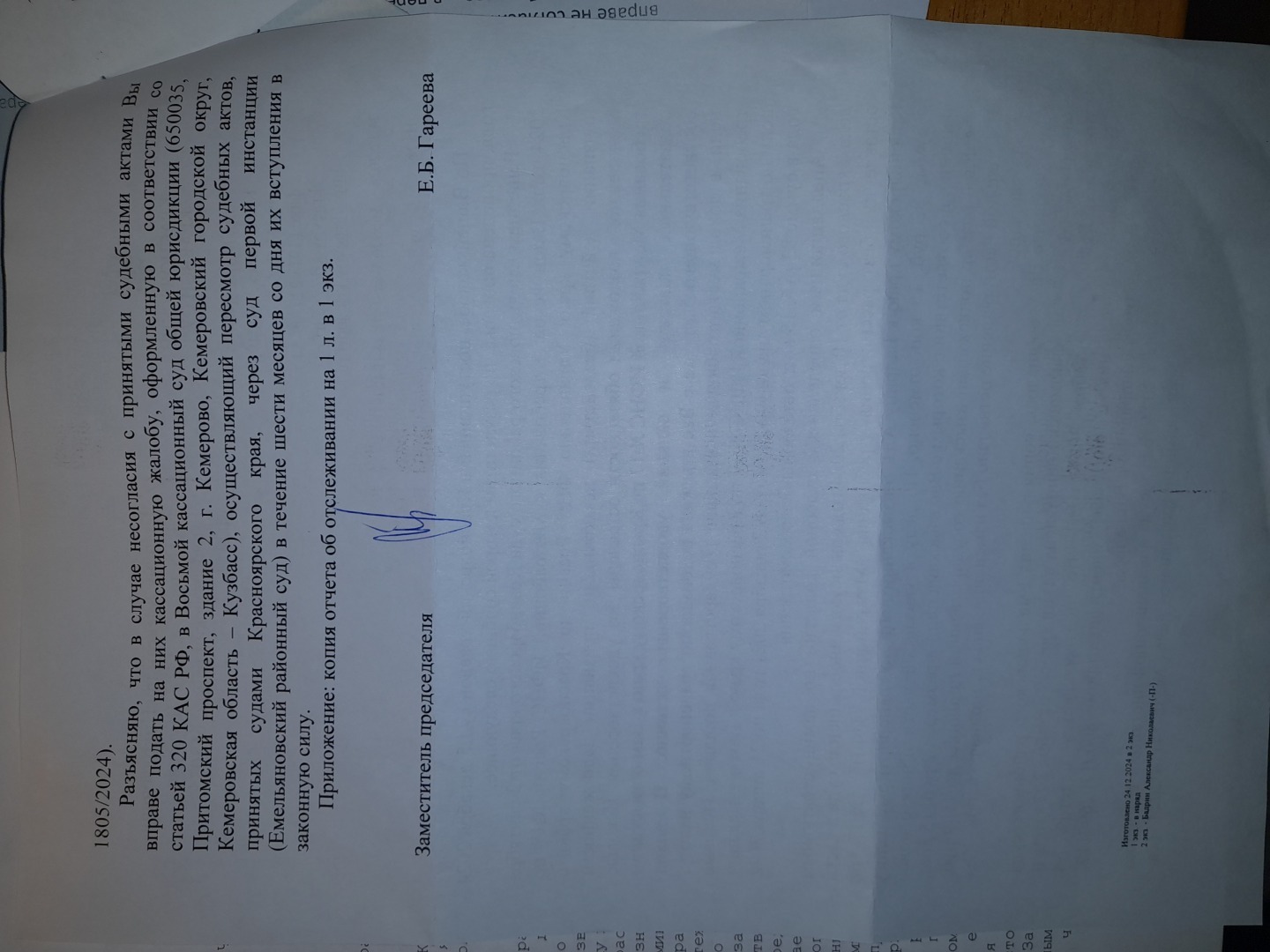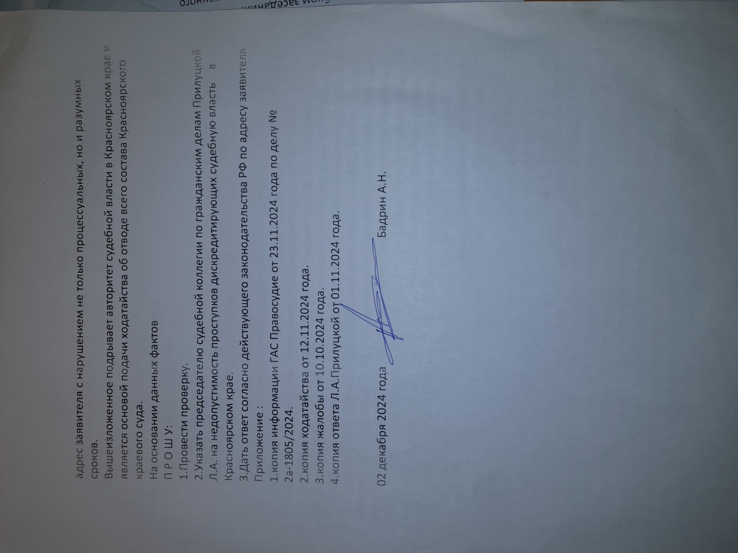 В жаллбе указаны факты бездействия председателя судебной коллегии по гражданским делам Красноярского краевого суда Л.А.Прилуцкой.Я уже неоднократно замечал, что данный представитель краевого суда всегда давала размытые ответы - туманные так сказать и вот другой представитель краевого суда уже заместитель председателя Е.Б.Гареева 24.12.2024 года дает ответ с перечислением дат движения дела