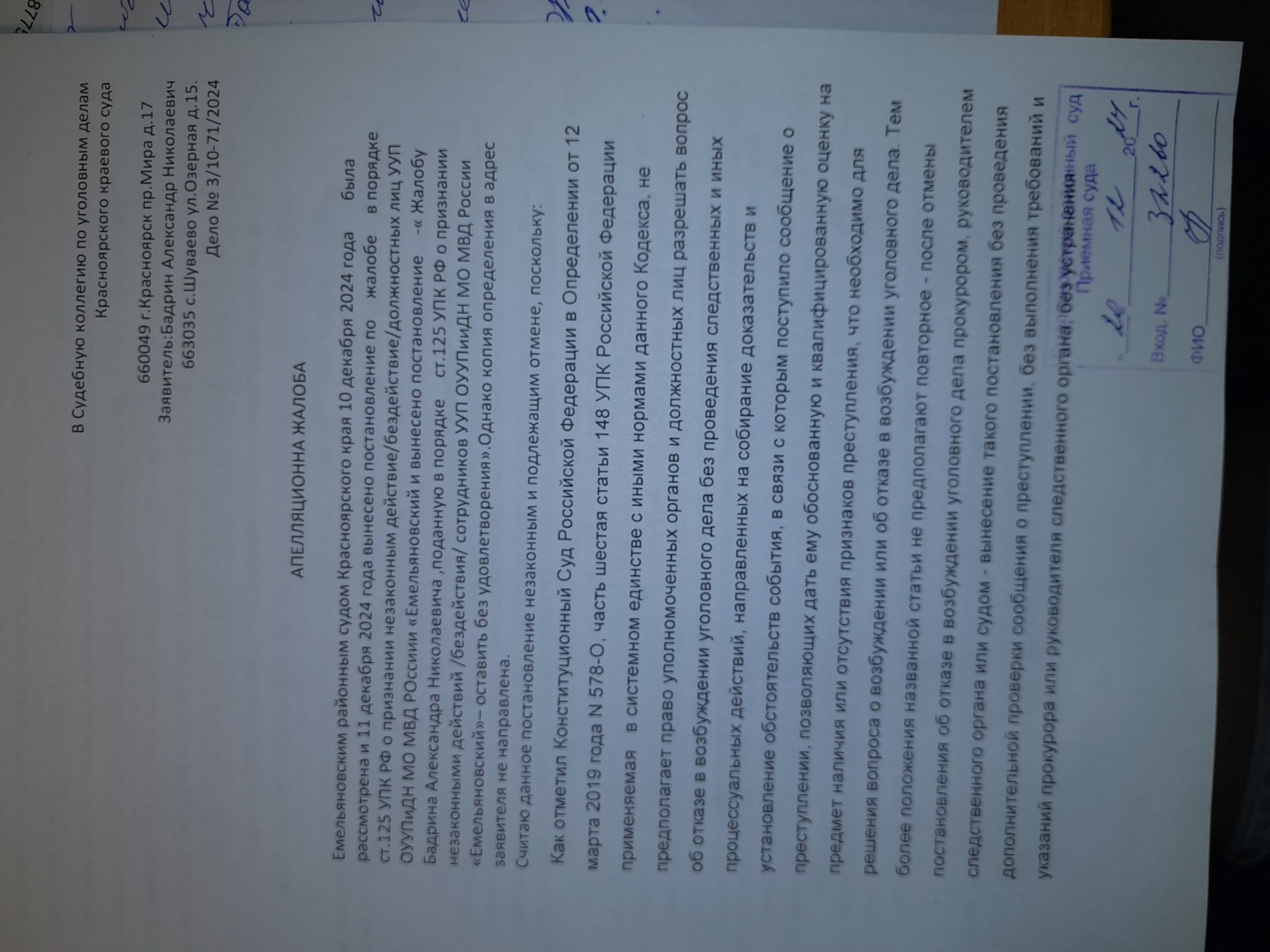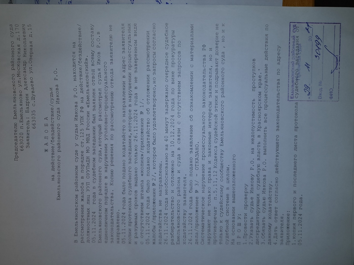 Теперь к суду первой инстанции - Емельяновскому районному суду вернемся.Подана такая жалоба