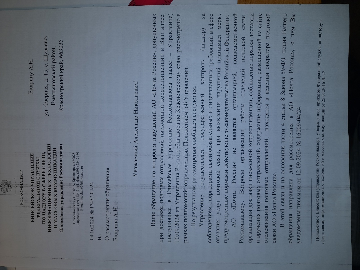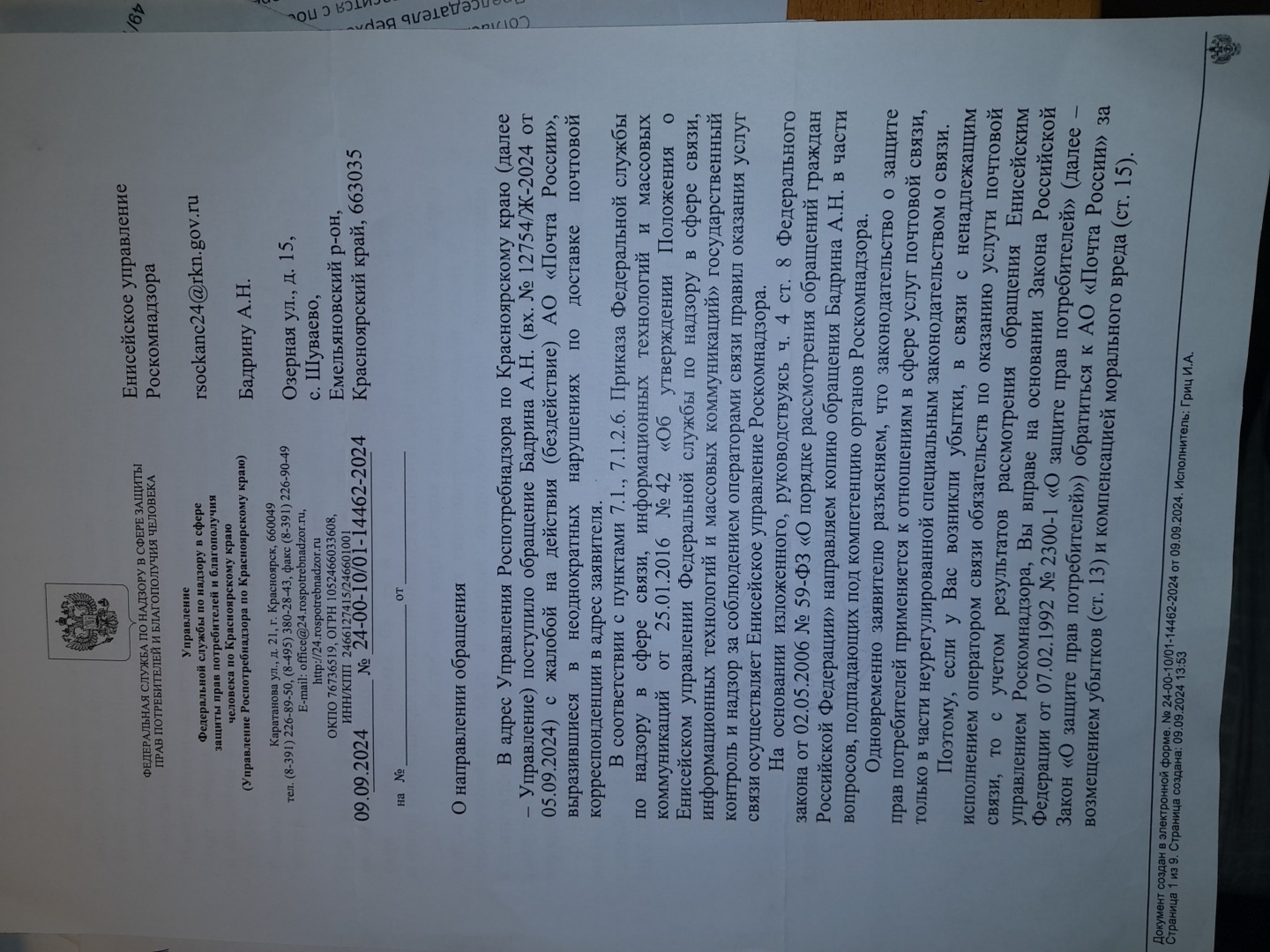 Не в компетенции это Роспотребнадзора и жалобу перенаправили в Енисейское управление Роскомнадзора.Ответ Роскомнадзора.Обратите внимание, что Роскомнадзору АО Почта России не подведомственна
