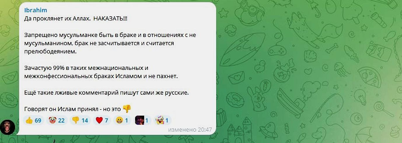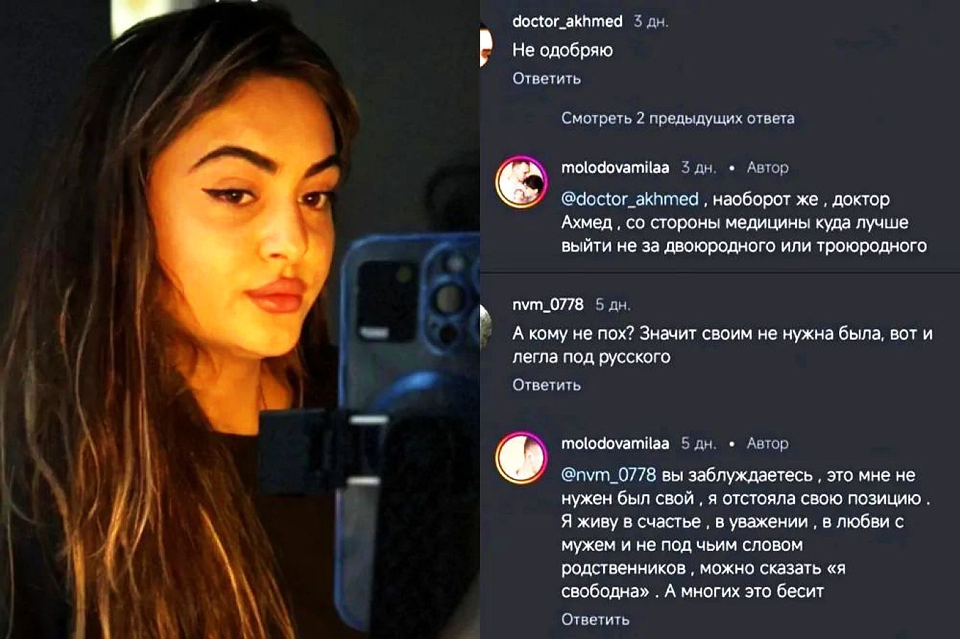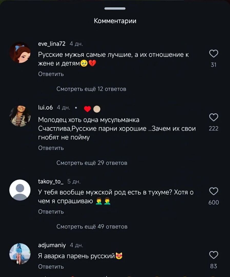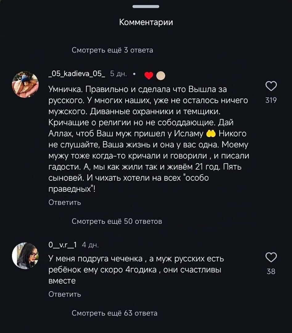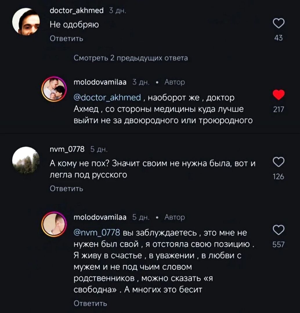 Самым интересным стало то, что девушку очень активно поддержали соотечественницы, тоже вышедшие замуж за руссих мужчин. А вот кавказцы были весьма недовольны межнациональным браком и высказали мнение, что молодая красавица просто не нужна своим.
