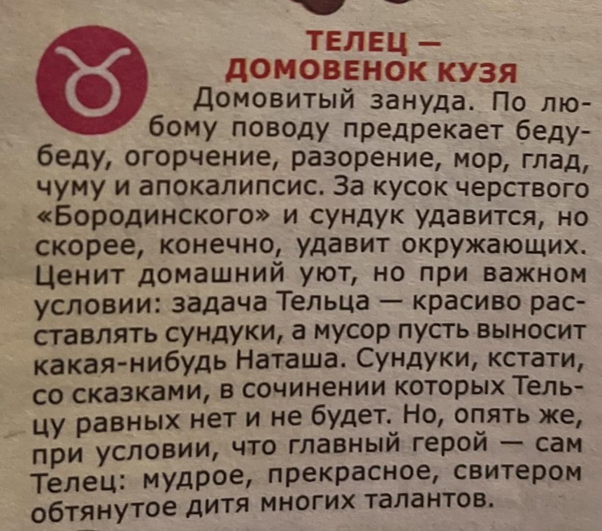 Вот эта забавная картинка про тельца. Там всего-то мне льстит "красиво расставляет сундуки" и "дитя талантов". Несколько аллегорически, но если вдуматься, то верно. А самые первые строки совершенно не про меня. Не буду хвастать особенно, но в любой экстремальной ситуации чувство паники - не моё. Включается именно чувство опасности и ничто другое, которое и помогает победить. А эти всякие сказки типа гороскопов я здесь на сайте ни одной не прочитал и впредь не собираюсь.