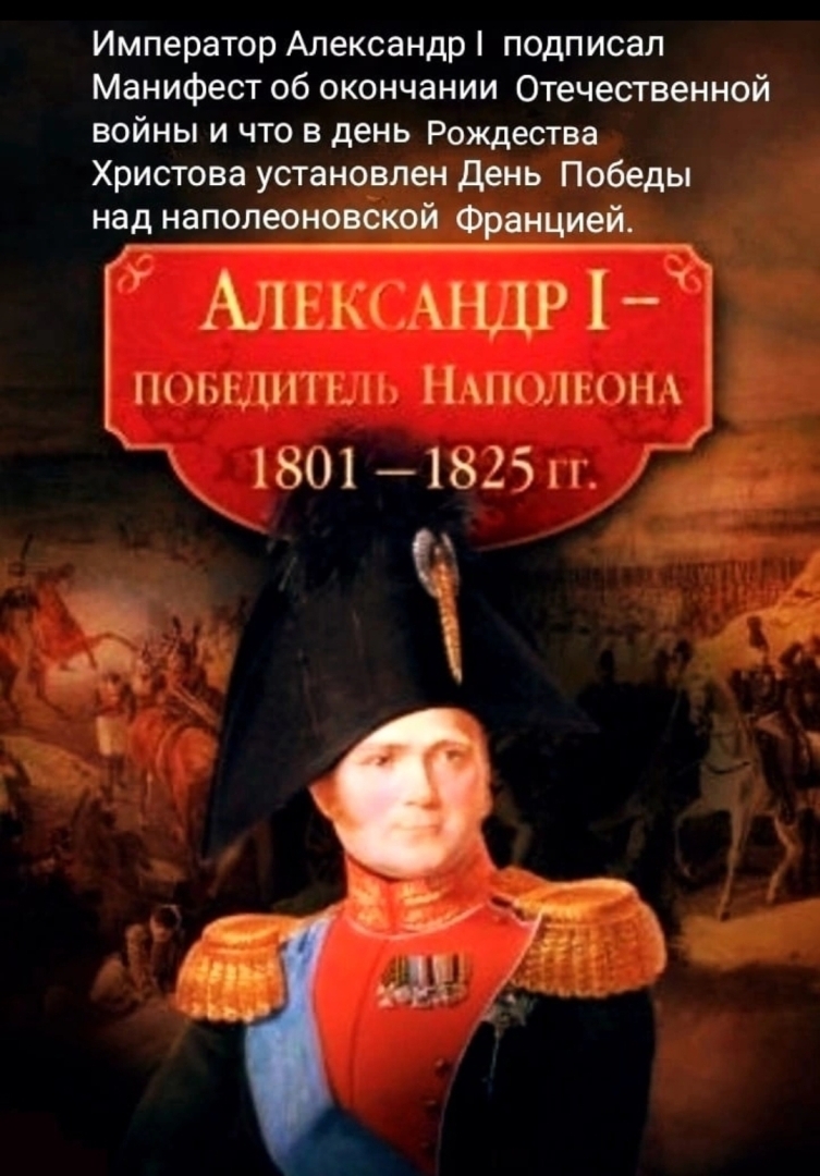 Несколько часов назад ехал с одним пожилым человеком коммунистических взглядов, с которым знаком уже давно и поздравил его с Рождеством Христовым, и с другим праздником, который мало кто знает, с Днём Великой Победы Русского народа в Отечественной войне 1812 г. , пояснив, что празднество Дня Победы официально было установленно Манифестом царя Александра I в День праздника Рождества Христова, когда последний солдат разгромленной 600 - тысячный армии Наполеона, куда входило двадесят языков, был изгнан из пределов России.