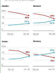 Внизу скриншоты с экрана, которые показывают в процентном отношении долю жителей за переговоры (синий цвет) и за продолжение помощи Украине в конфликте (красный цвет) в границах времени начало 2023 года и лето 2024 года. Источник - газета The Guardian.