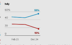 В Италии таких «упрямых» уже не более 15%. Четыре ключевые страны Европы показывают прагматичность и предпочтительность переговоров конфликту. Германия 43%, Италия 55%, Испания 46%, Франция 43%. В "лагерь мира" вошли Болгария, Греция и Италия.