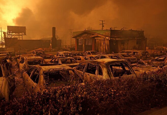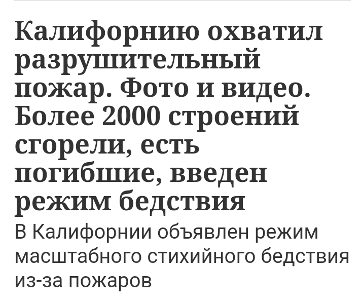"Более 2 тыс. строений сгорели и по меньшей мере пять человек погибли из-за лесных пожаров, бушующих по всему округу Лос-Анджелес. Это один из самых разрушительных огненных штормов, обрушившихся на регион за всю историю."