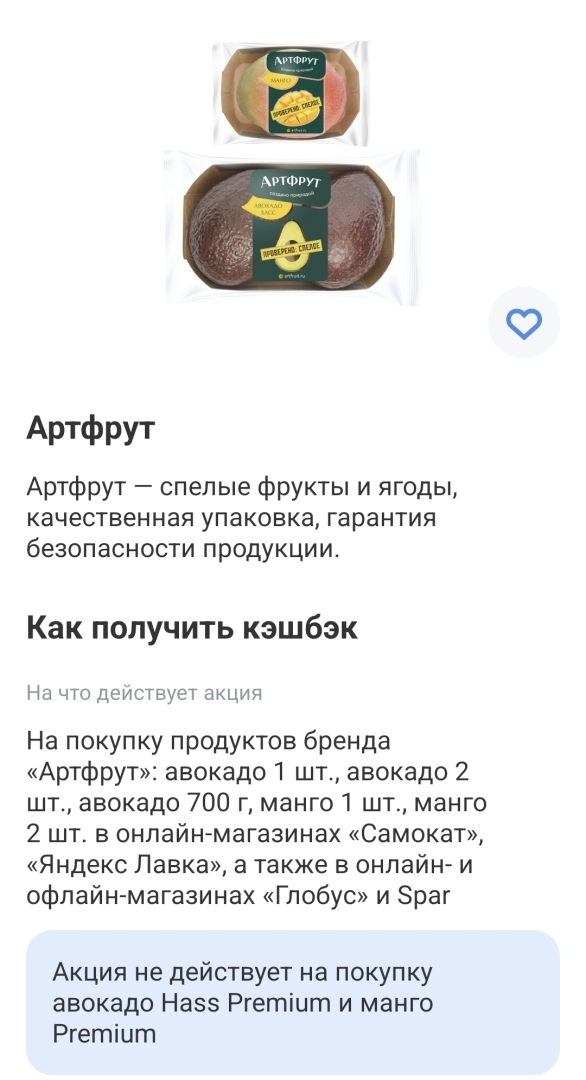 На авокадо и манго бренда Артфрут 50 % кэшбека от Т-банк. Магазины не только Самокат, есть и другие...