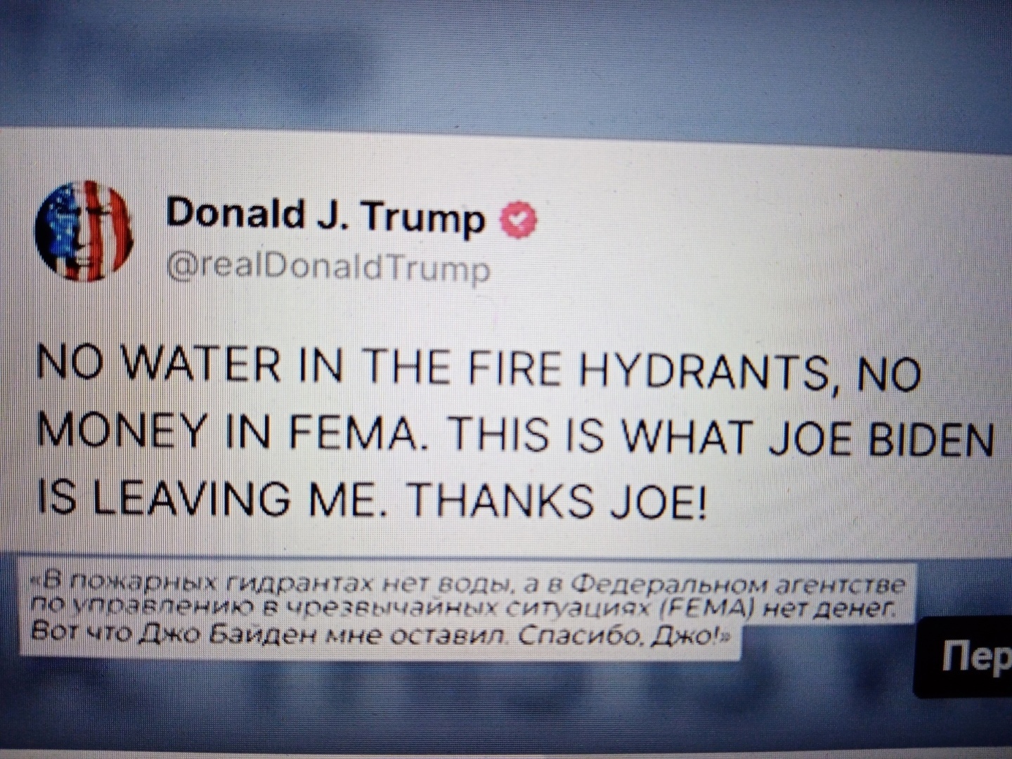 Джон Байден был осуждён критикой за своё бездействие. И как потом оказалось, что свою последнюю на посту президента международную поездку он отменил. А в утешение пострадавших от пожара американцев Байден объявил своему сыну, который там живёт на Малибу, что его дома, вероятно, тоже сгорели.