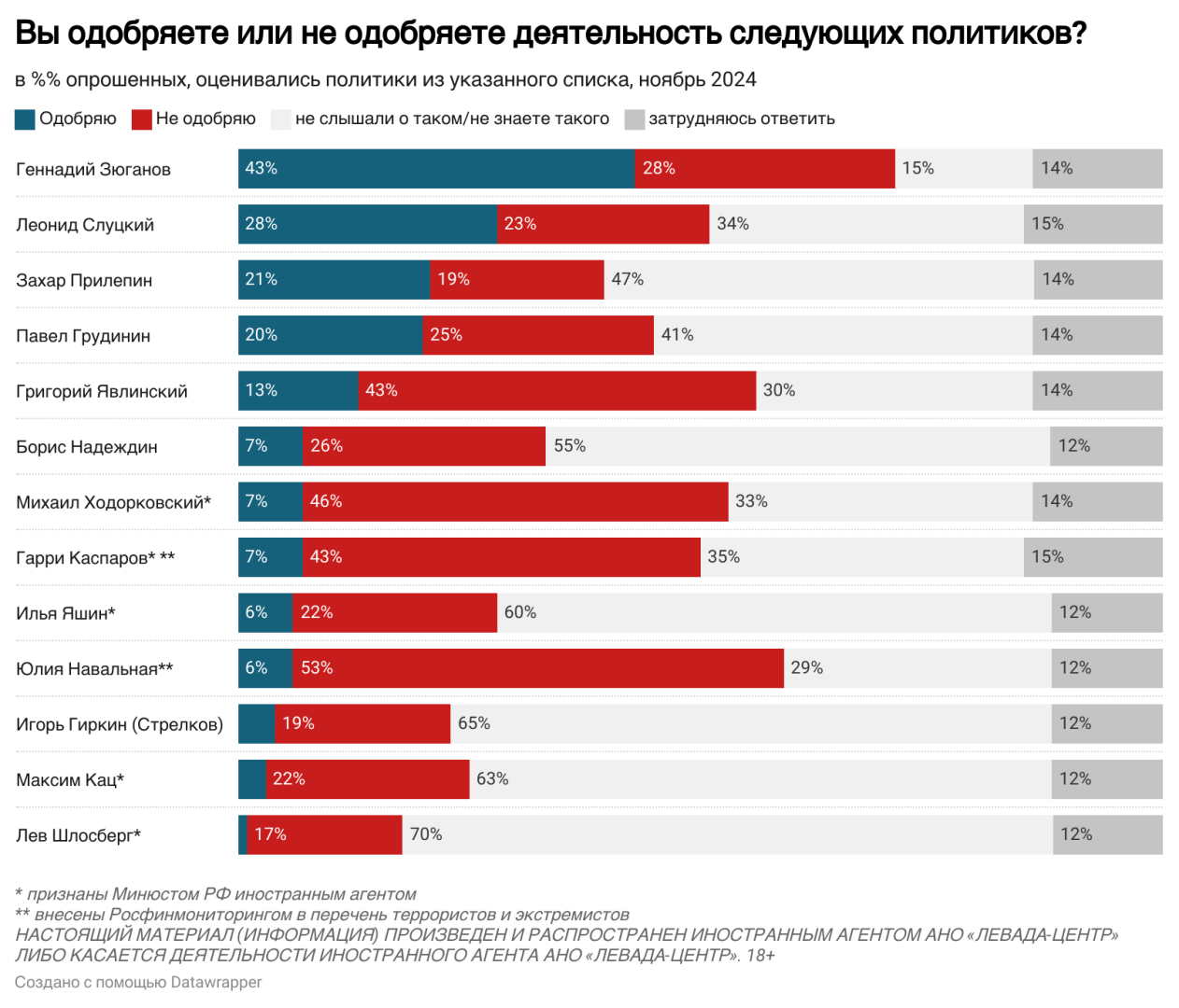 В декабре 2024 года АНО «Левада-центр***»* обнародовал результат опроса, который был проведён в ноябре месяце, о рейтингах и антирейтингах оппозиционных политиков России. Кроме оппозиционных политиков в список респонденты внесли и политиков, которые признаны в стране иностранными агентами и внесены Росфинмониторингом в перечень террористов и экстремистов.