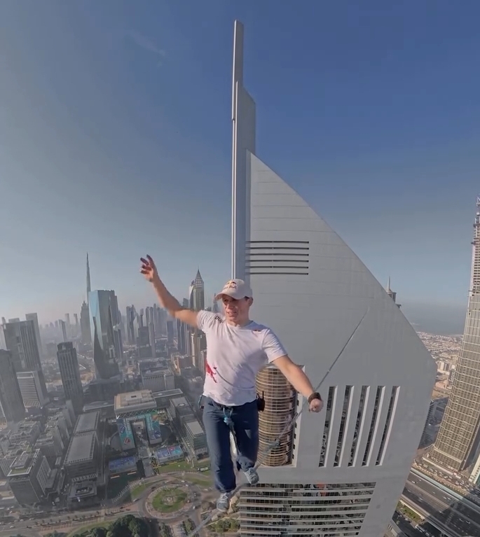 Это его образ жизни, увлечение у него такое - по канату ходить на большой высоте ...
