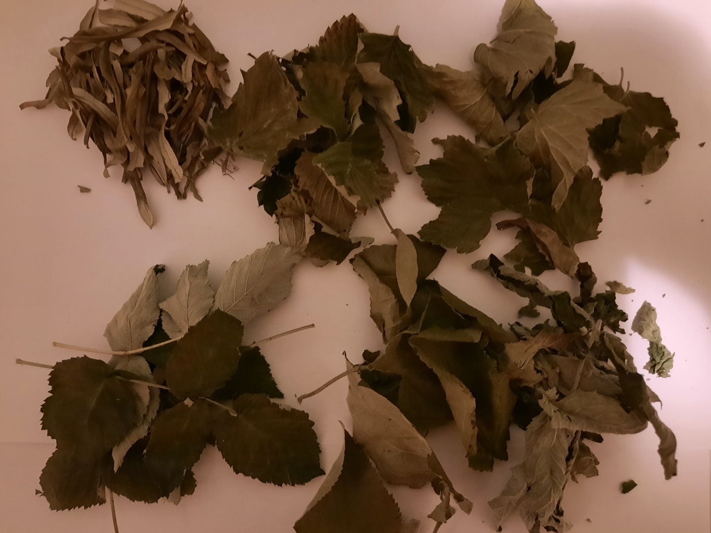 На участке ещё растёт яблони и ежевика – тоже собираем листья и потом сушим в хозблоке.