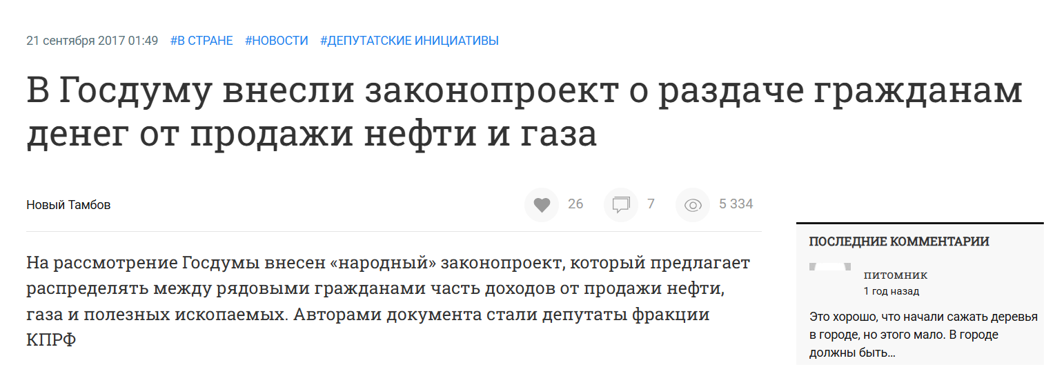 А давайте 15% доходов от продажи ресурсов отдадим народу! Давайте! Не новая инициатива от КПРФ!